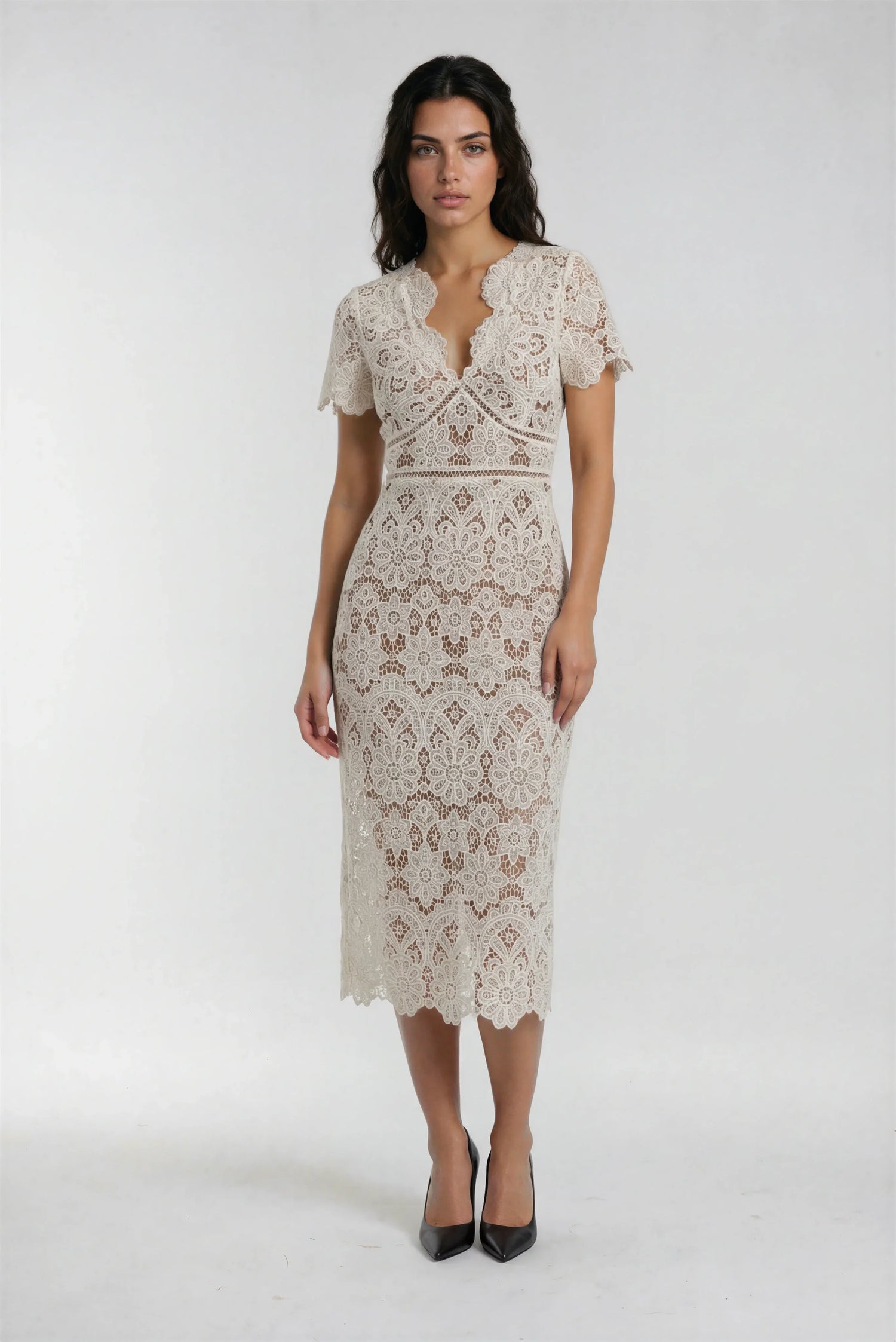 23% İndirimKrem Ortadan Fermuarlı Dantel Elbise