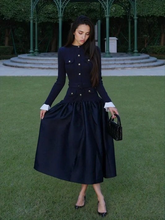 18% İndirimLacivert Örgü Eklemeli Uzun Kollu Elbise