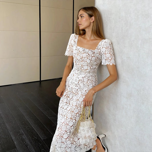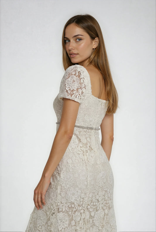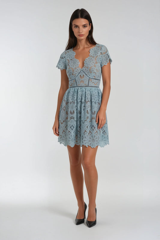 33% İndirimÖzel Dantel İşlemeli Beyaz Mavi Mini Elbise