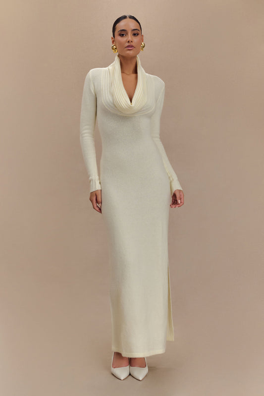 Alessandra Çift Taraflı Örme Uzun Elbise - Fildişi Marle
