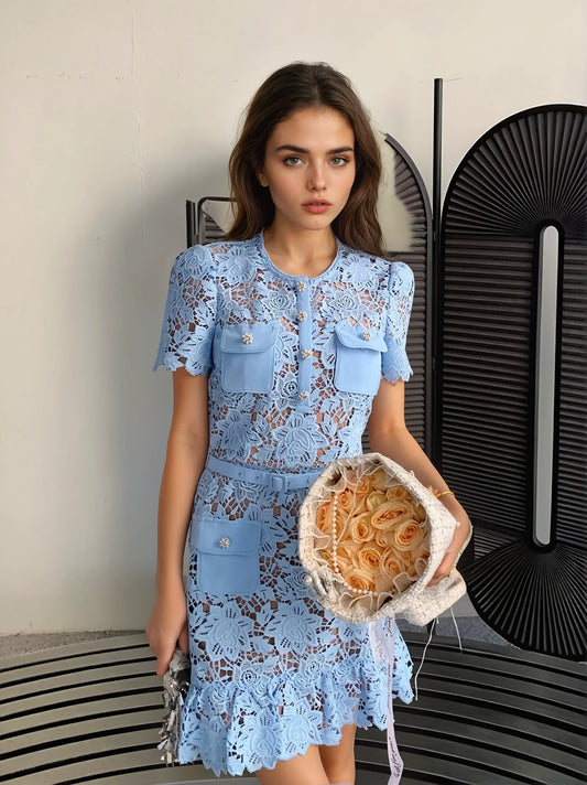 21% İndirimAçık Mavi & Beyaz Dantel İşlemeli Elbise