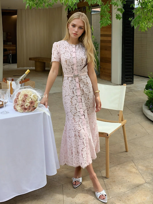 21% İndirimAçık Pembe Kirpik Dantelli Elbise