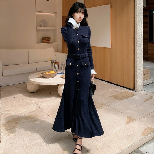 18% İndirimLacivert Örgü Eklemeli Uzun Kollu Elbise