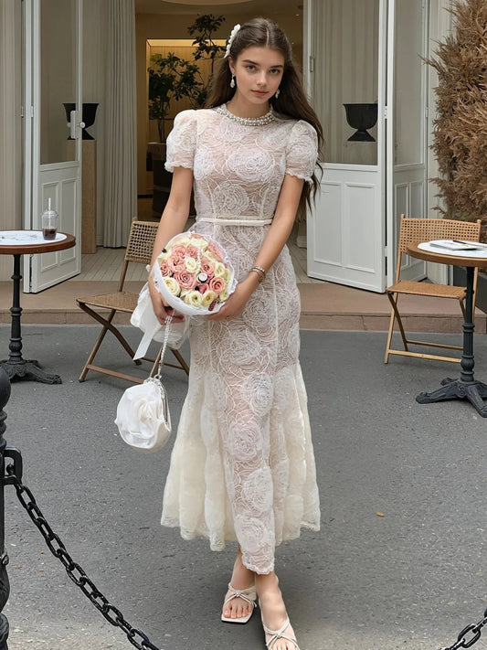 34% İndirimBeyaz Taşlı Dantel Uzun Elbise