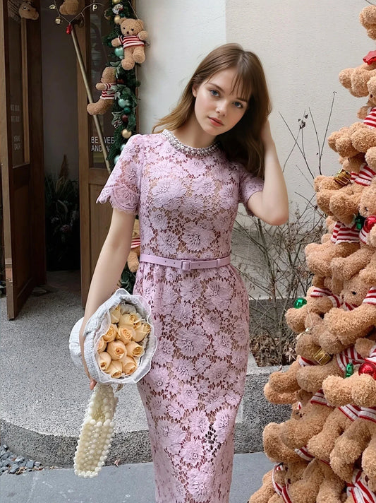 35% İndirimLeylak Dantel Önü Düğmeli Midi Elbise