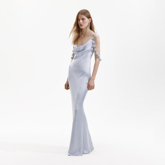 35% İndirimMavi Saten Çiçekli Uzun Elbise