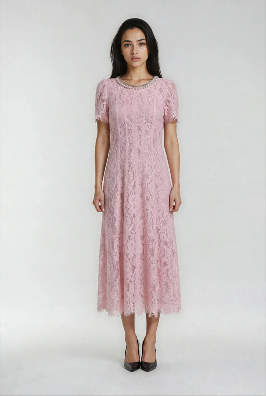 7% İndirimPembe Kirpik Dantelli Payet Elbise