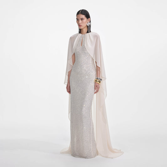 35% İndirimKrem Taşlı Pelerinli Uzun Elbise