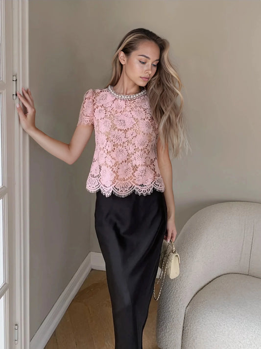 35% İndirimPembe Tığ İşi Çiçekli Örgü Üst