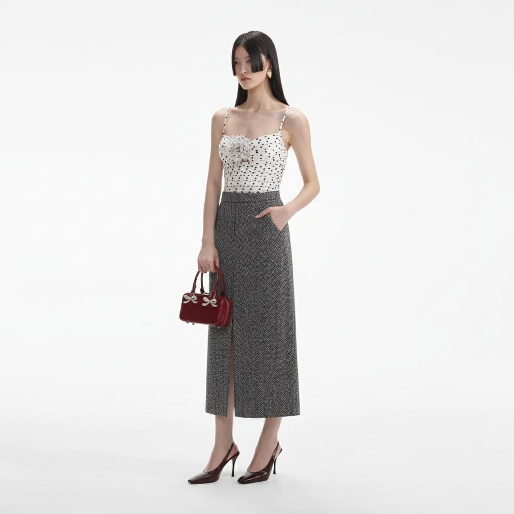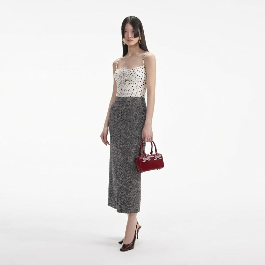 Hazırlık dozu, heykelsi formda klasik kesimli kılcı kemik desenli bu midi etekle kolayca sağlanır ve ön yırtmaç ile dikkat çeker. Masadan akşama şıklık için bir gömlekle kombinleyin.