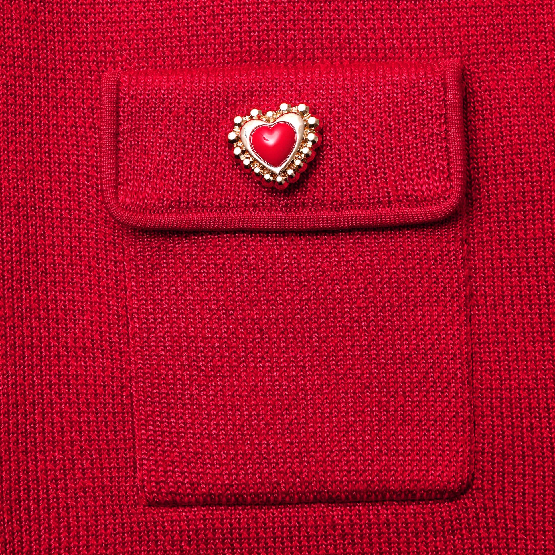 Bir takım kıyafeti çok seviyoruz ve bu etek — cesur kırmızı triko, kalp düğmeler ve şık şekillendirilmiş kesimi ile — unutulmaz bir akşam randevusu görünümünün yarısı. Tam etki için bizim iddialı küpelerimizle eşleştirin.