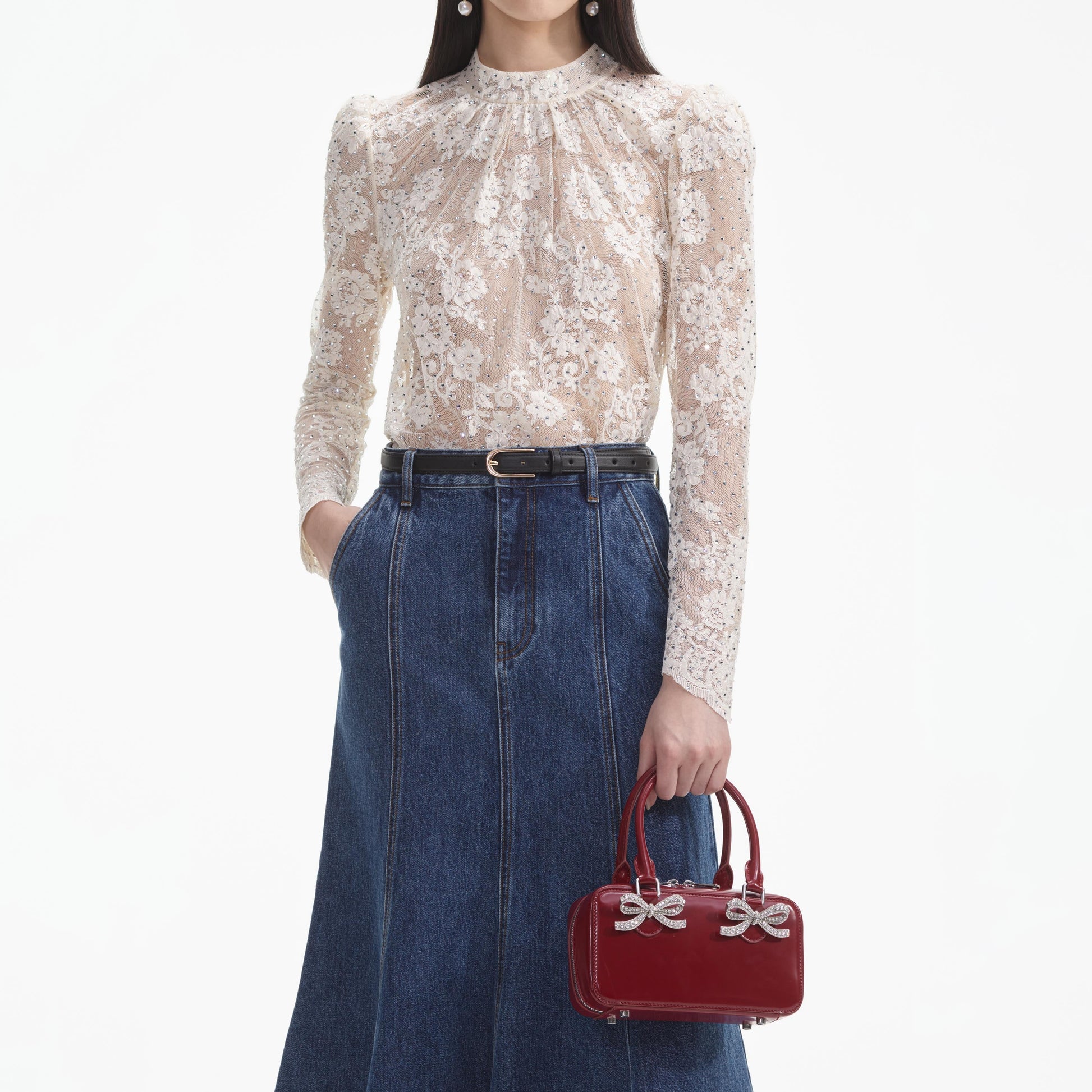 Romantizm ve cazibe, bu taş işlemeli dantel üstte şık tırtıklı yakayla arzu edilen bir ikili oluşturuyor. Kızlar gecesi için mini bir etekle veya gündelik şıklık için iddialı kotumuzla kombinleyin.