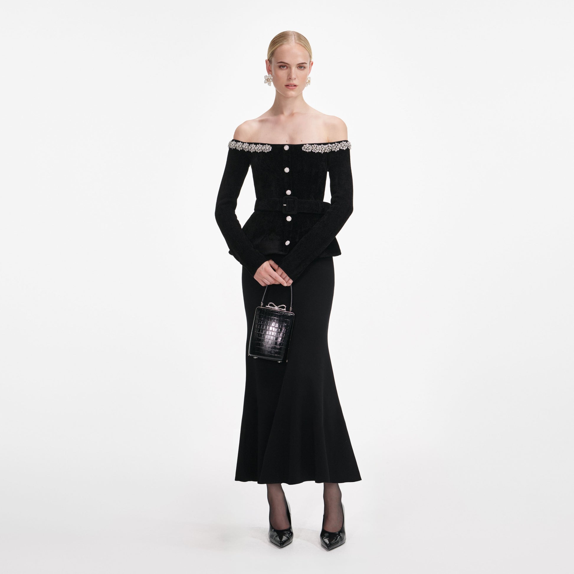Şönil örgü kumaş kullanılarak yapılmış, vücudu saran bu küçük siyah elbise en beğenilenler arasında. Diamanté süslemelerle çevrelenmiş omuzları açık Bardot yaka, duyusal bir detay katıyor – şık bir geceye hazır olun.