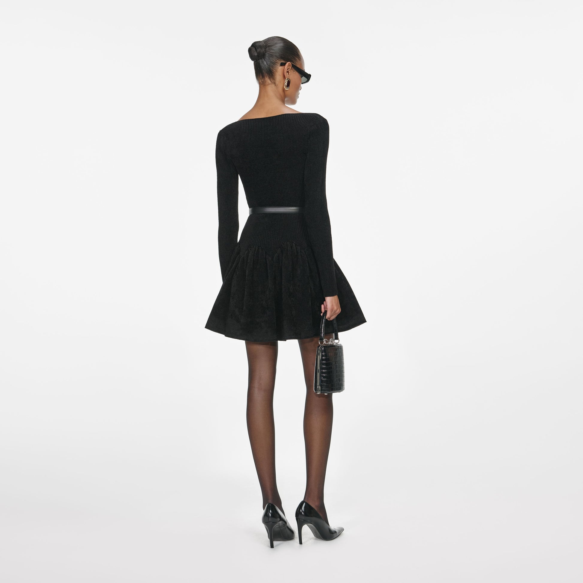 Siyah şanel örgü elbise ile zamansız şıklığı yakalayın. Yuvarlak yaka, uzun kollar ve kuşaklı bel ile çerçevelenmiş – çalışma etkinliklerinde ve bale gezilerinde stiletto topuklarla güneşlenen salaş etek ucunu gösterin.