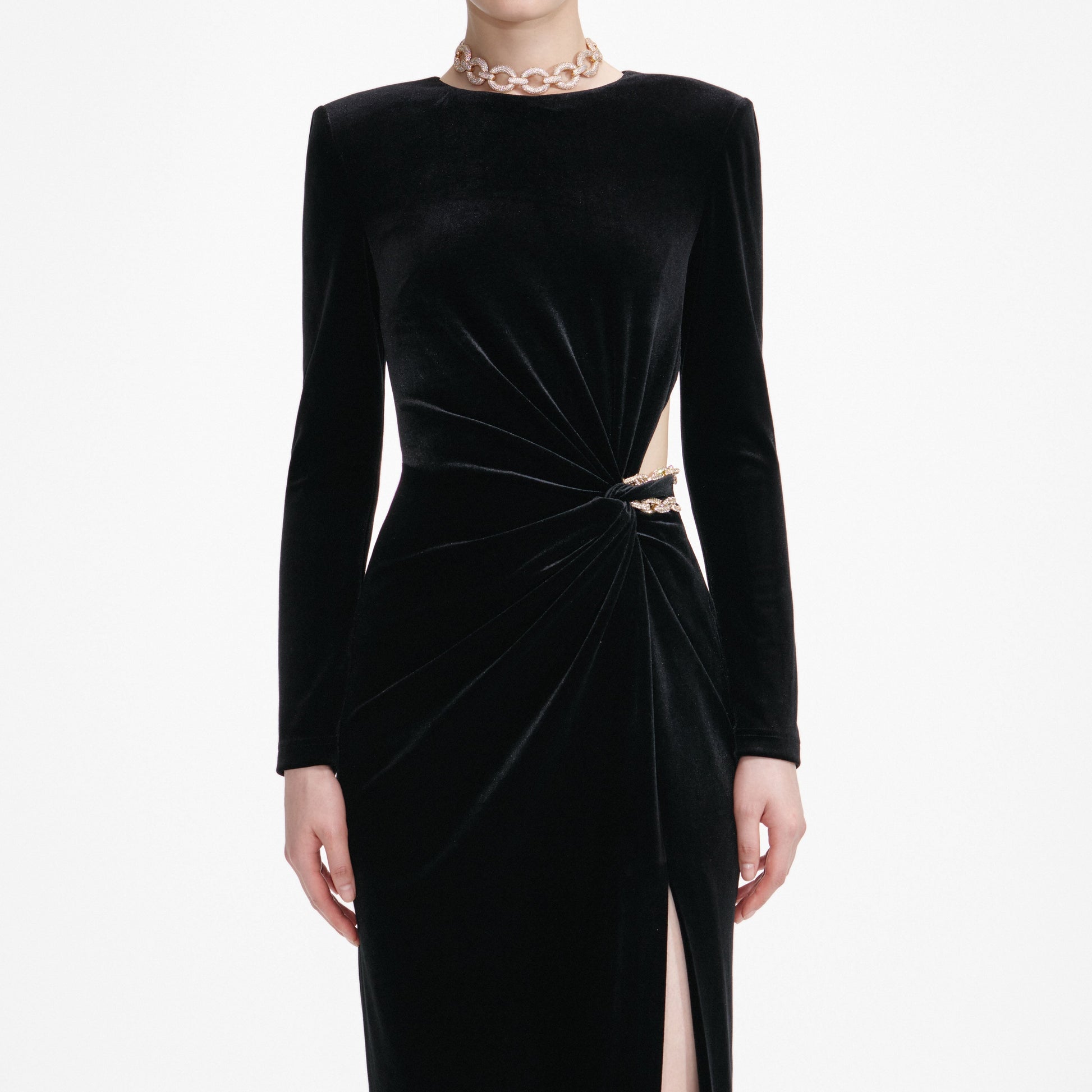 Cesur yan kesimler, bu siyah kadife maxi elbiseye dramatik bir hava katıyor. Çağdaş parlaklık için diamanté süslemeli altın zincirlerle detaylandırılmış – içindeki femme fatale’i yansıtmak için topuklu ayakkabılarla kombinle.
