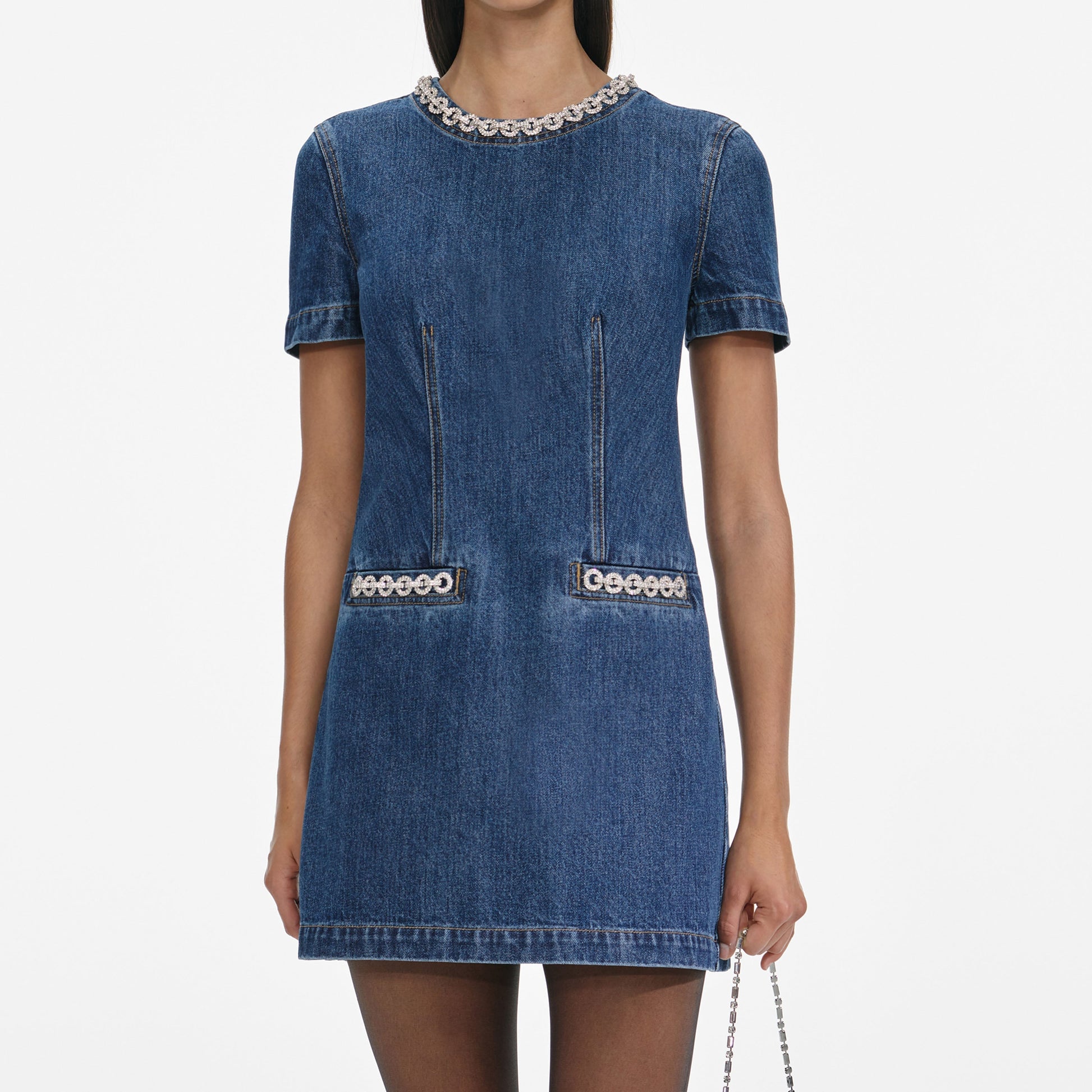Bu elbisenin rahat silueti ve kristal zincir detayları, zamansız gerçek mavi denimle mükemmel uyum sağlar. Bir sonraki müzik festivalinde botlarla kombinleyin veya kızlarla karaoke için gökyüzü yüksekliğinde topuklular ekleyin.