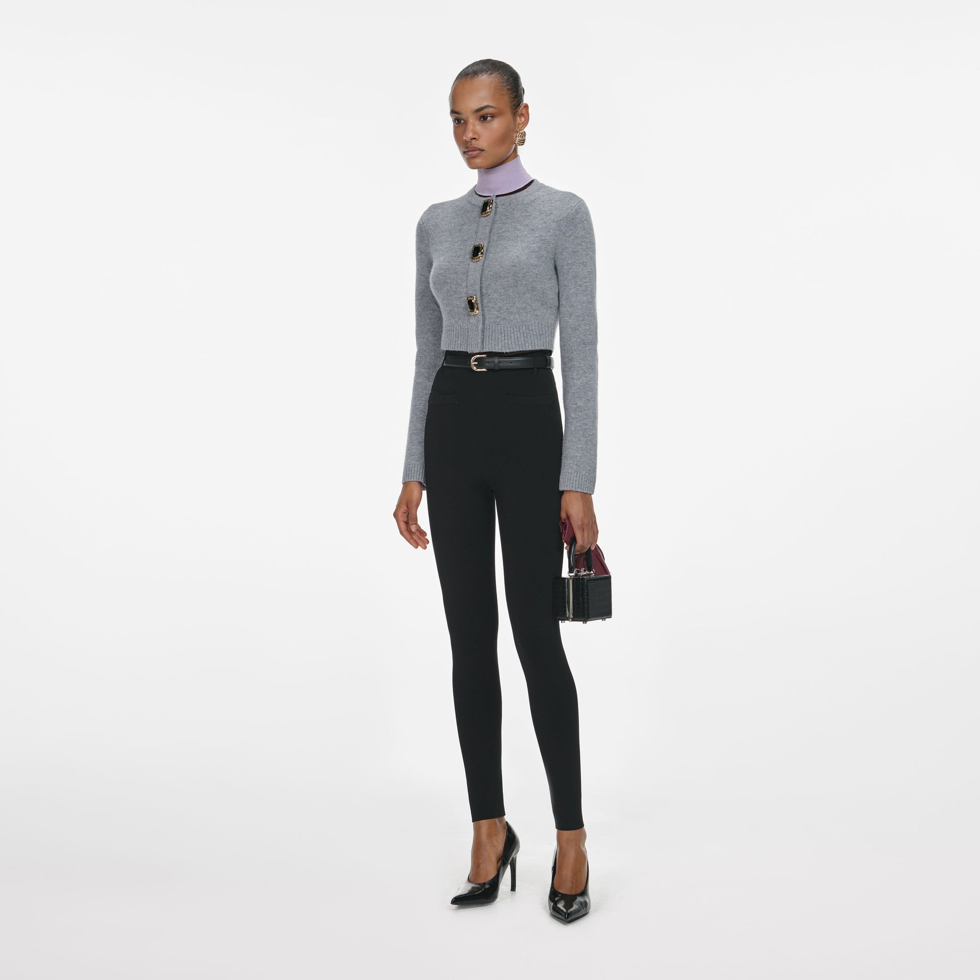 Bu gri yün hırka ile şık bir ifade yaratın, vintage esintili benekli altın ve siyah düğmelerle tamamlanmıştır. Formu vurgulamak için kesilmiş, bol kot pantolondan mini eteklere kadar her şeyle giyilebilir.