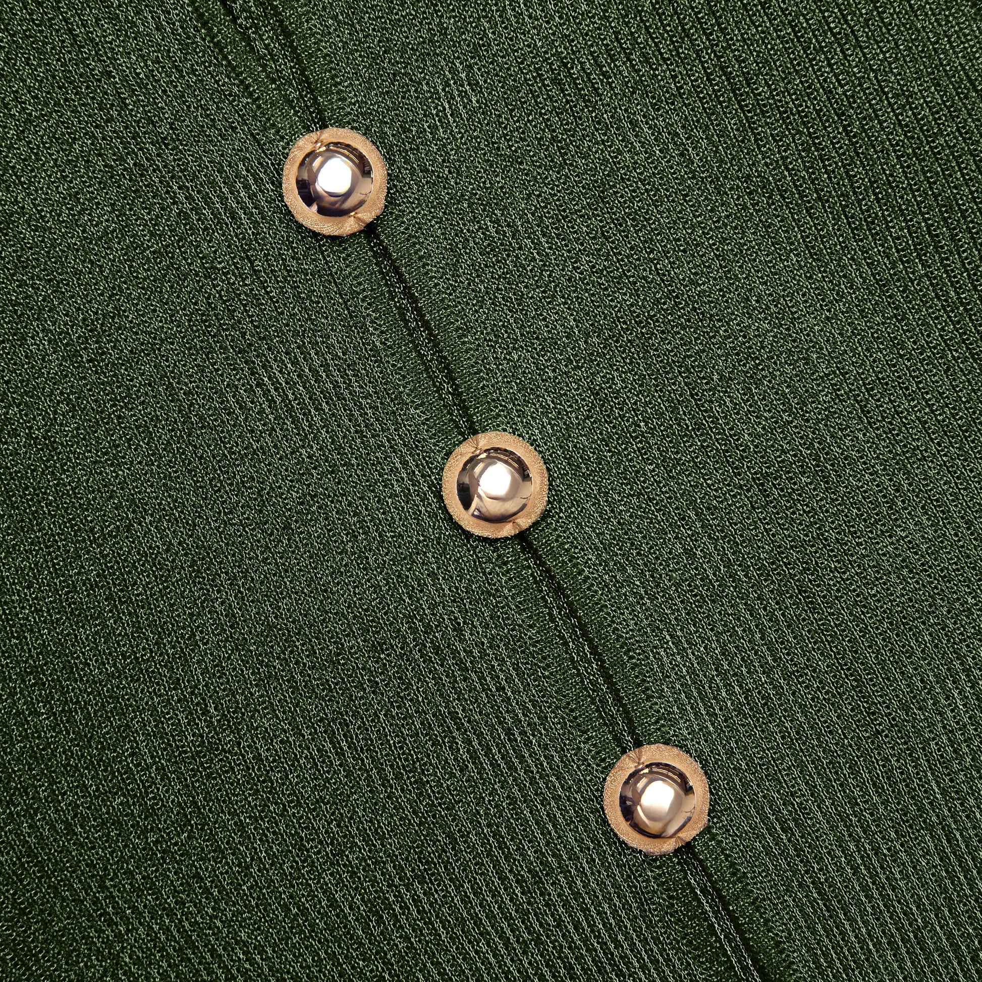 Heykelsi bir oturuş için haki lurex ile örülmüş bu maksi elbise, rahatlıkla şık olmanızı sağlar. Ön kısmındaki cesur anahtar deliği kesiklerini vurgulayan altın düğmeler – etkileyici bir giriş için topuklu ayakkabı ekleyin.
