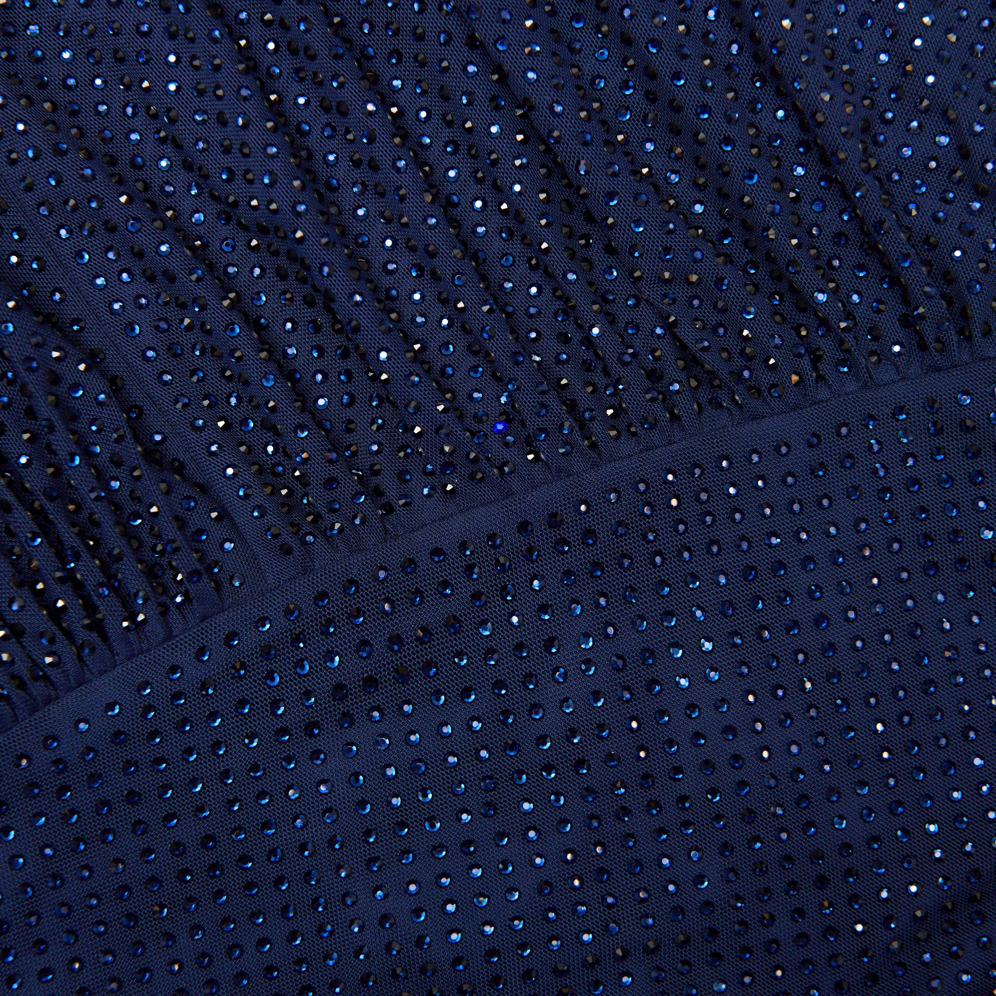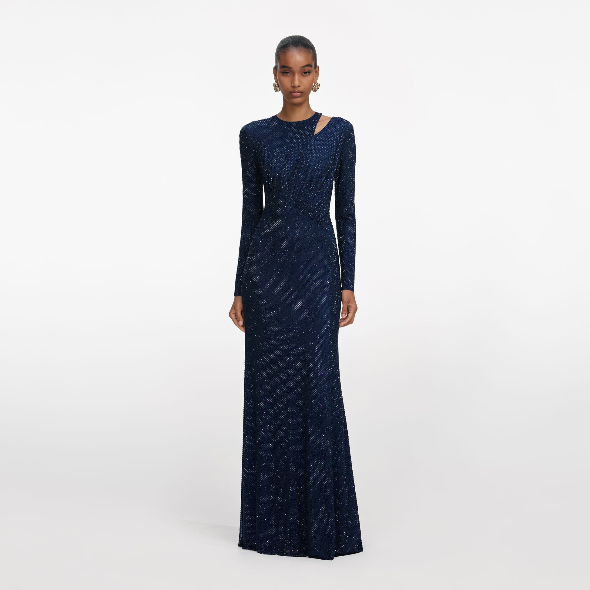 Stras taşlarla süslenmiş file kumaştan kesilmiş bu lacivert maksi elbise, parlak dokusunu şık bir silüetle ve uyumlu cesur bir kesimle bir araya getiriyor. Cesur yaka detayını iddialı küpelerimizle sergileyin.