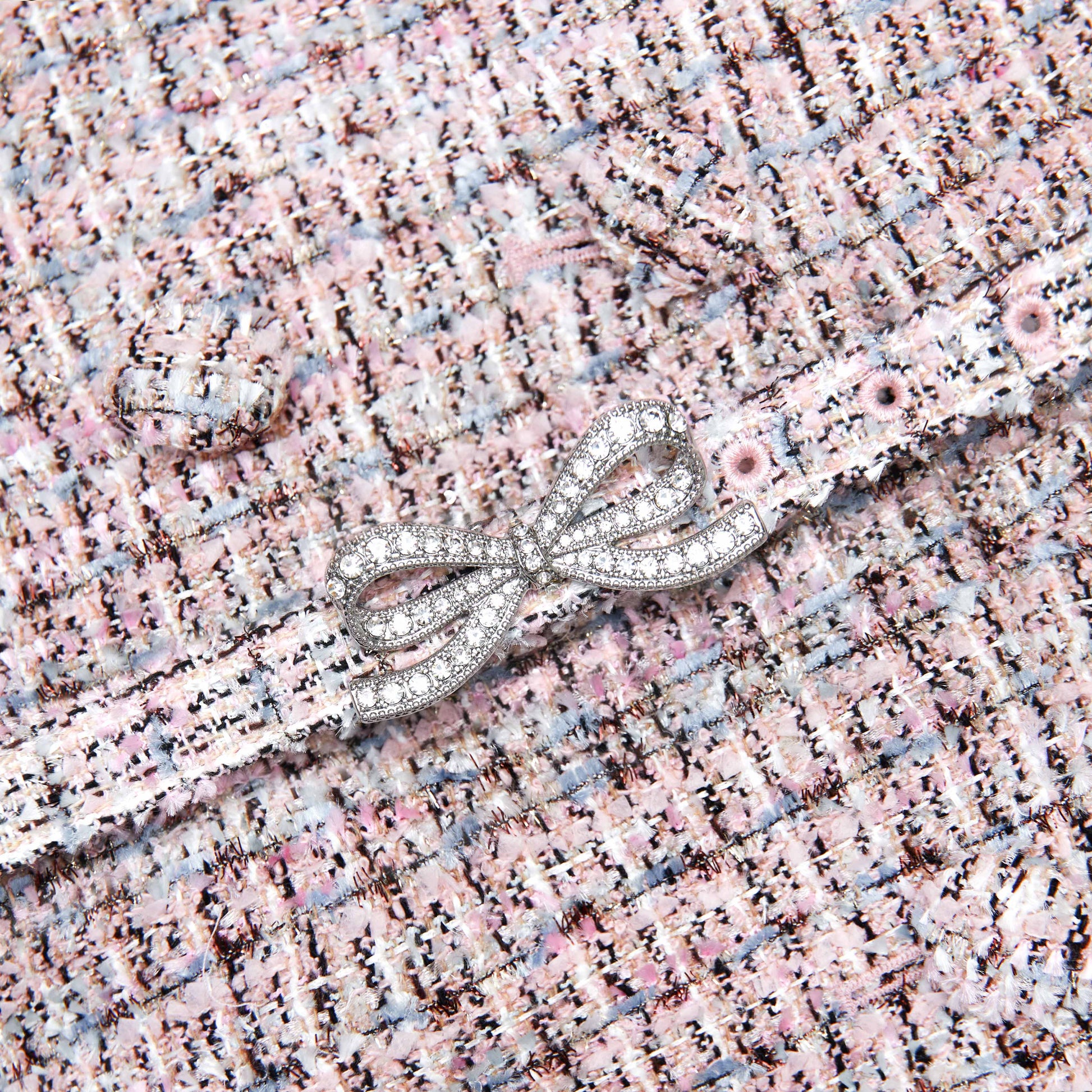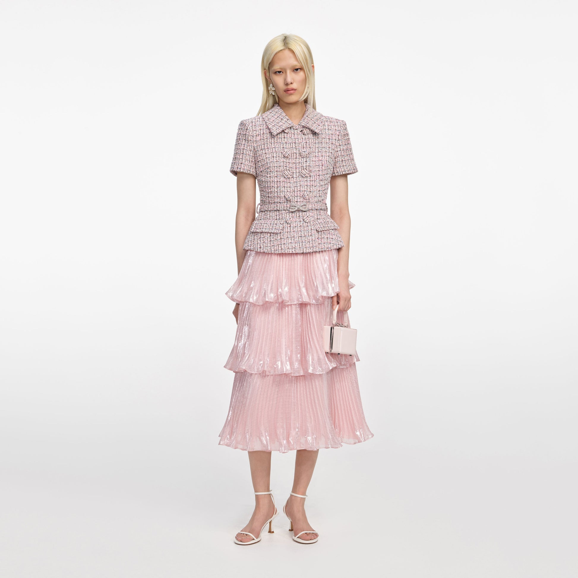Sanatsal zıtlıklar dersi, özel dikim bouclé blazer, bu pembe midi elbise ile katmanlı metalik pilelerle buluşuyor. Diamanté fiyonk detaylı kemerinin parlaklığını, dikkat çekici küpelerimizle eşleştirin.