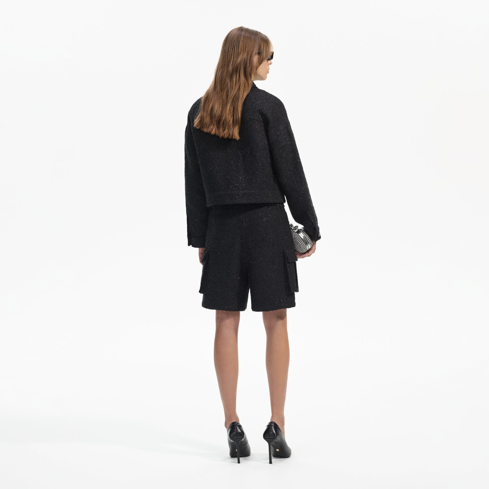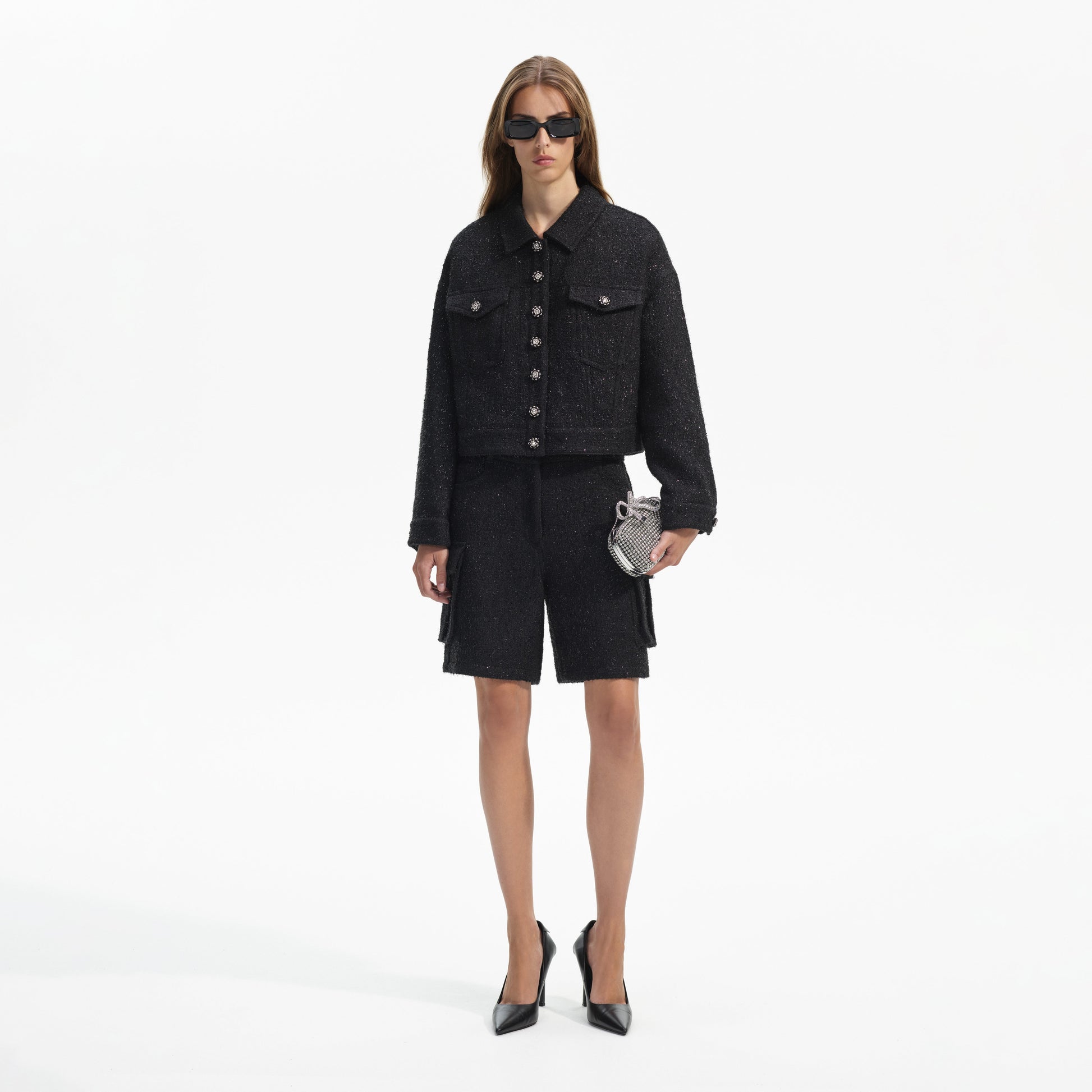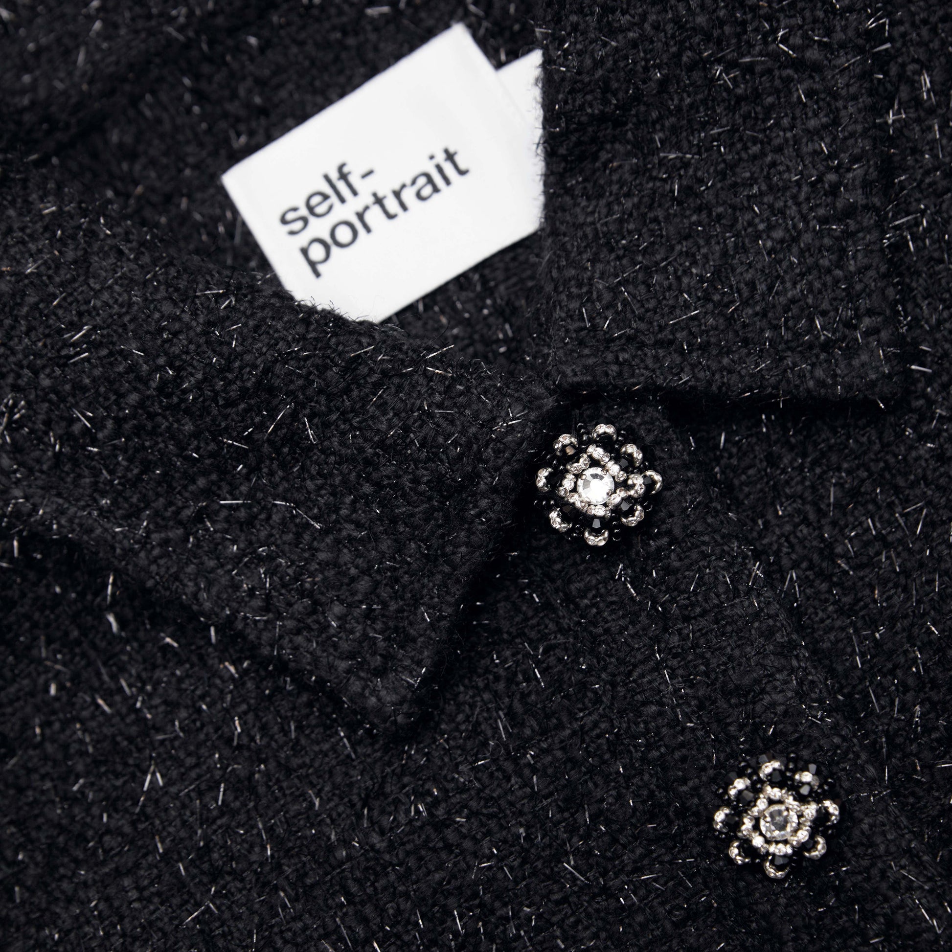 Rahat, bol kesimiyle bu siyah buklé ceket oyunbaz bir hava katıyor, elmas taşlı düğmelerle daha da belirginleşiyor. Gündüz denim ile kombinleyin veya akşam için küçük siyah elbisenizin üzerine atın.
