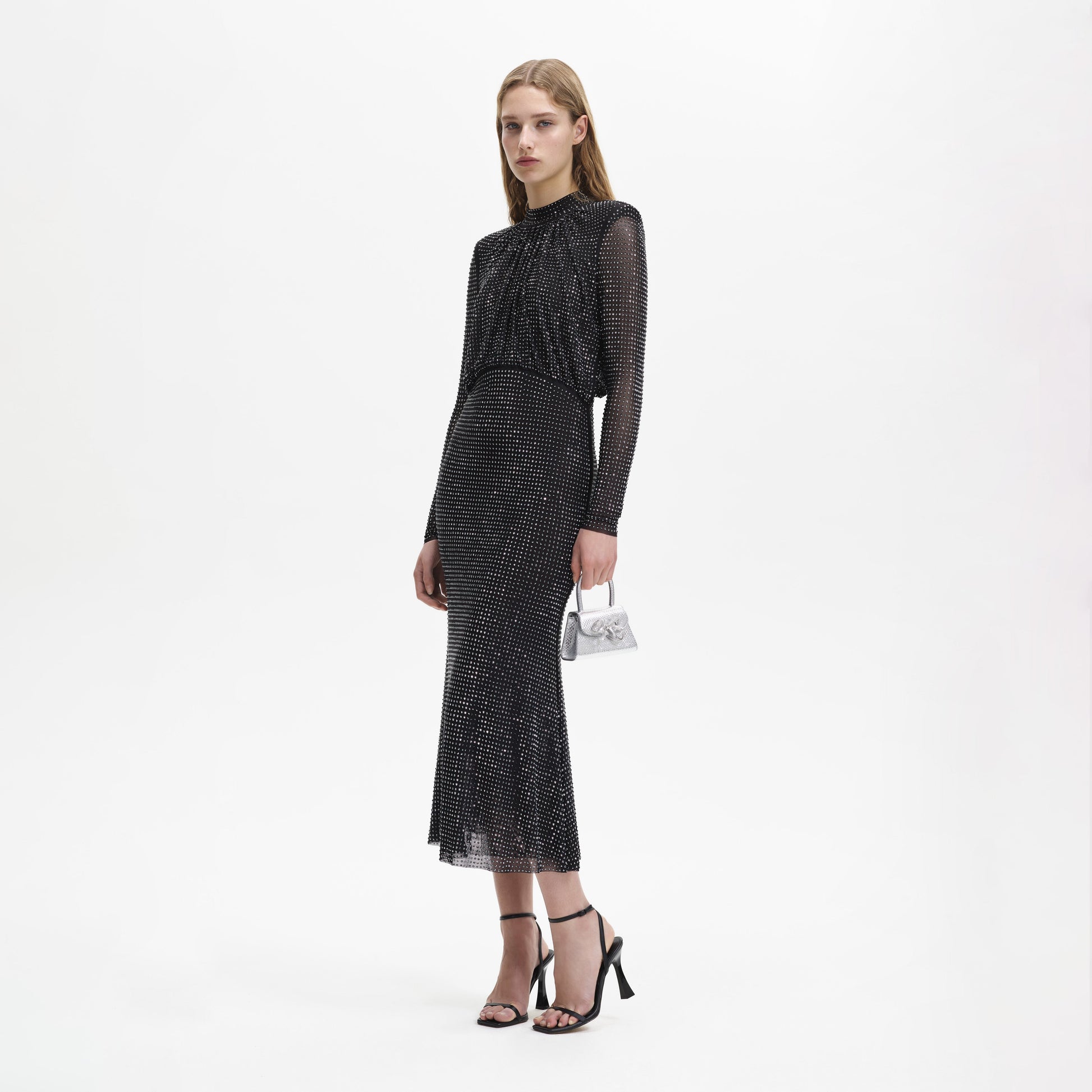 Siyah Elmas File Uzun Kollu Midi Elbise