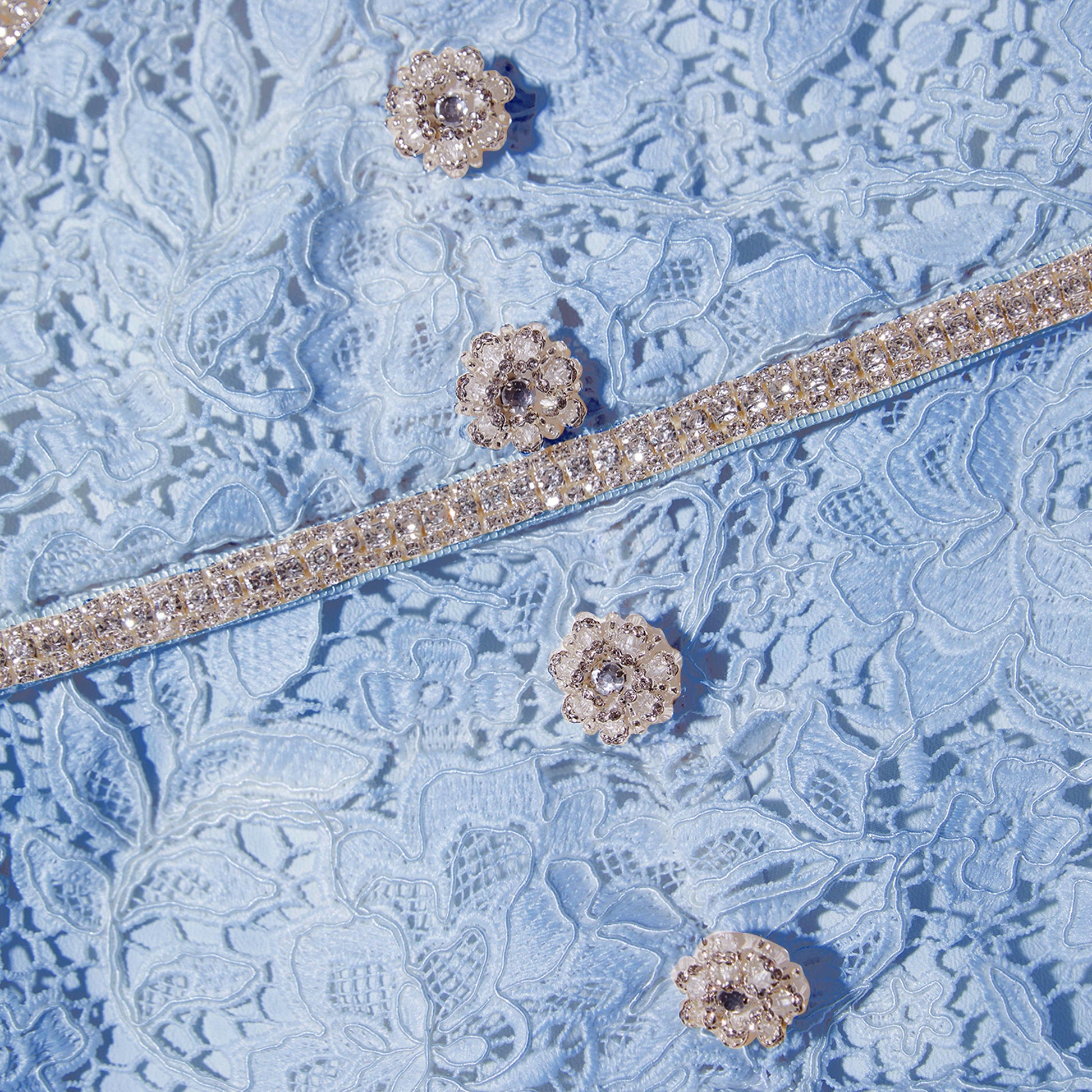 Mavi dantelden sakinleştirici bir görünüm sunan bu elbise, zengin çiçek dokularını evrensel olarak herkesin beğeneceği bir silüetle sergiliyor. Bir sonraki gece davetinizde parıldayan aksesuarlarla diamanté fiyonğunu yansıtın.
