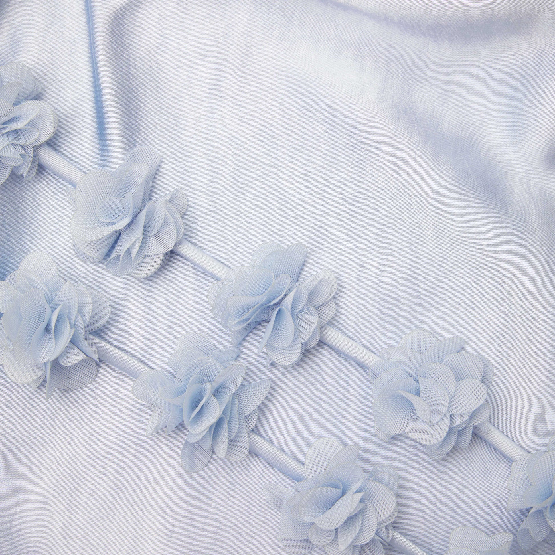 Bebek mavisi saten, bu elbise için klasik bir siluet oluşturur ve hoş bir drapeli yakaya sahiptir. En özel detay? İnce çiçekli süslemeler, zarif görünüme ekstra bir romantizm katıyor.