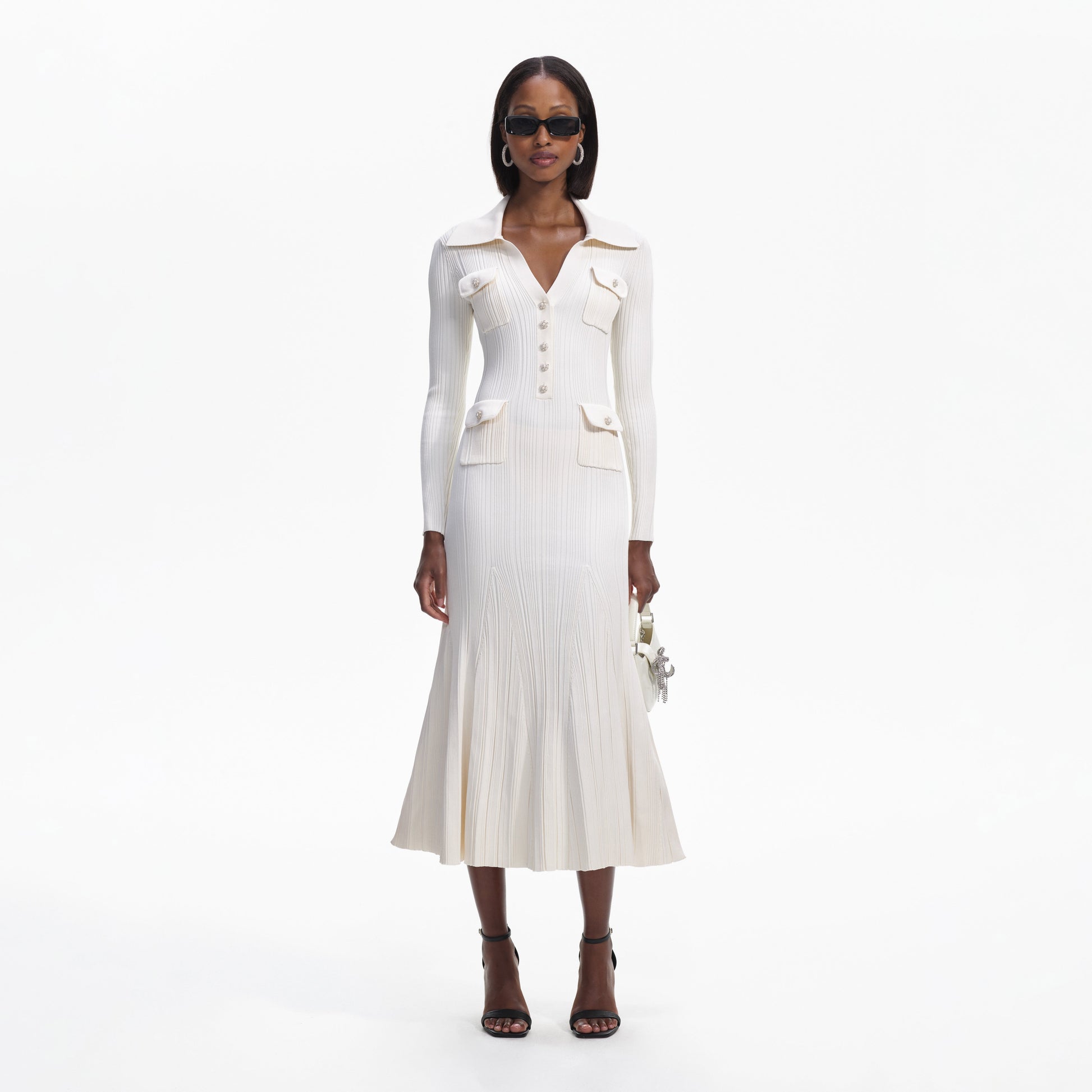Kolayca şekillenmiş bir siluet için lüks bir fitilli triko kullanılarak tasarlanan bu elbise, ofisten akşam yemeğine geçişi çok kolaylaştırır. Parlak yakalı yaka ve cepleri, ışığı yakalayan ışıltılı kristal düğmelerle süslenmiştir; şık kesim ve genişleyen midi etek ucu ise kadınsı bir çekicilik katar. Kazanan (ve giyilebilir) bir görünüm için dize kadar olan çizmelerle kombinleyin. Mükemmel bedeninizi bulmak için Beden Rehberine göz atın.
