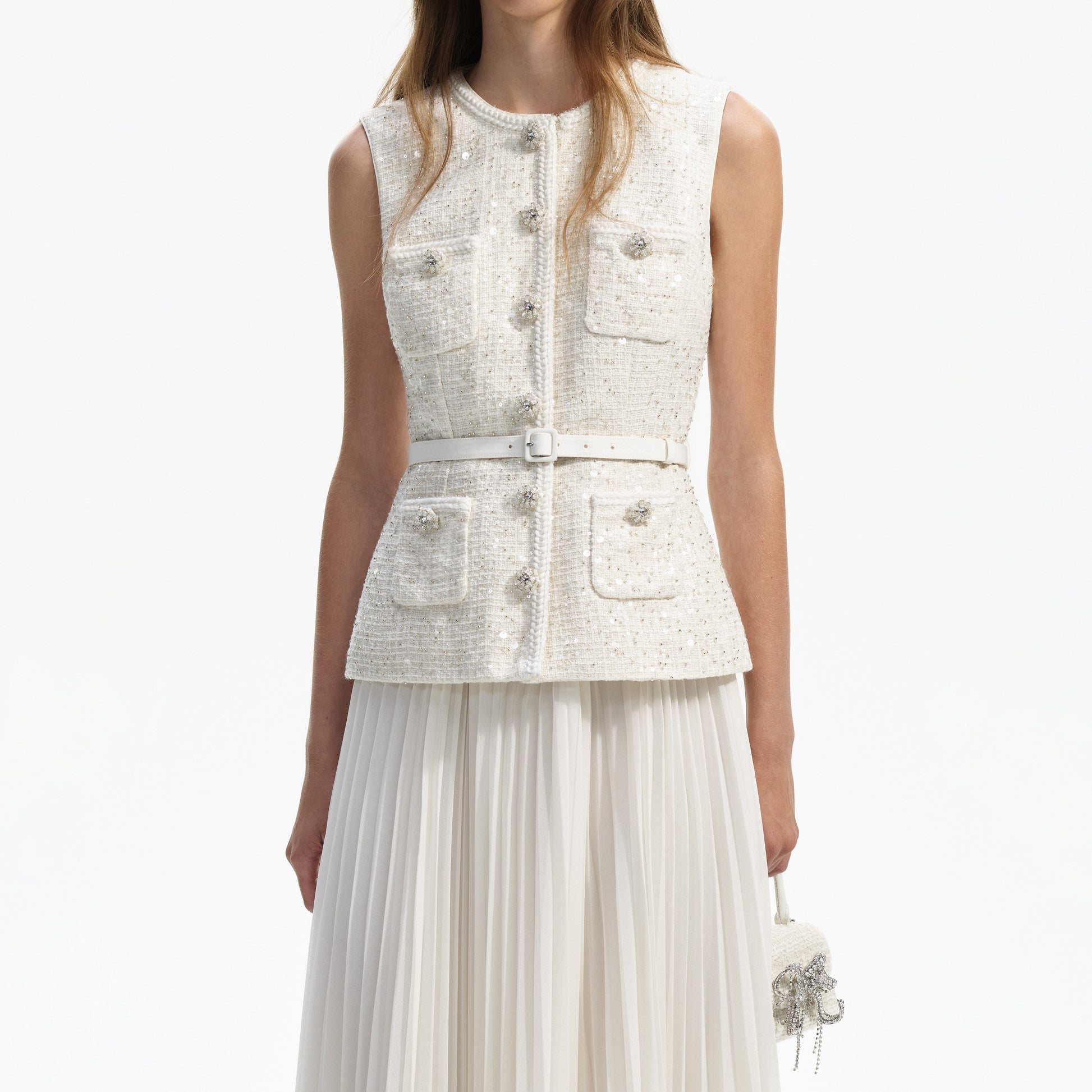 Bir gelin için uygun olan bu elbise, yumuşak yapısı ve parlaklığı için payetli bukle kumaştan kesilmiştir. Belden sıkıştırılmış ve diamanté düğmelerle süslenmiş olan elbise, dönen bir chiffon eteğe sahiptir.