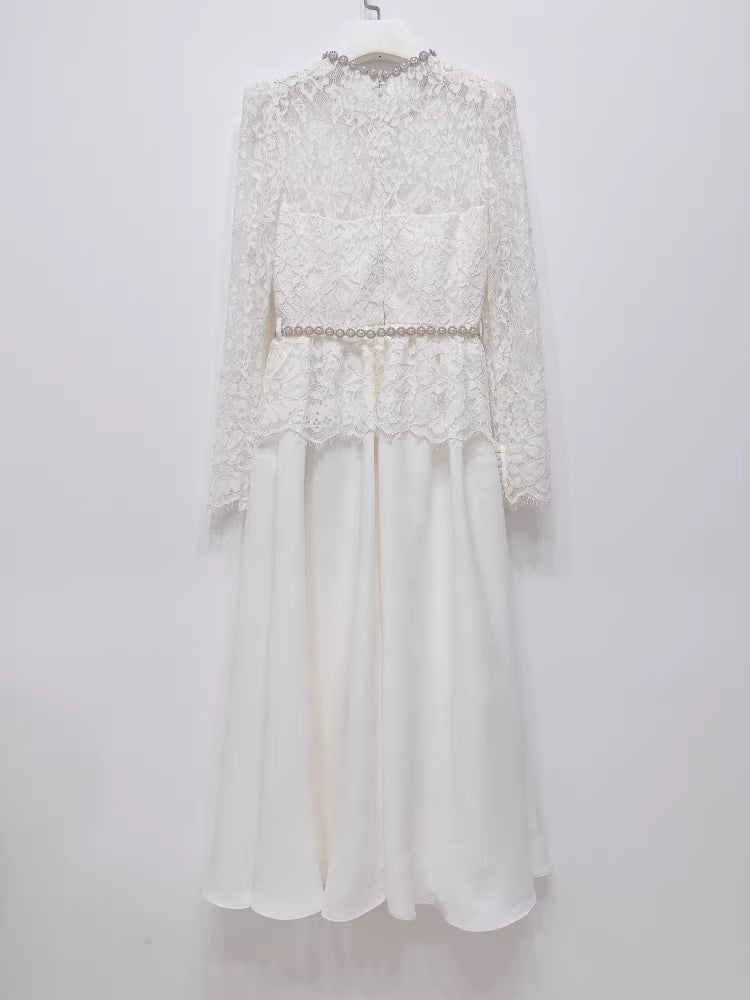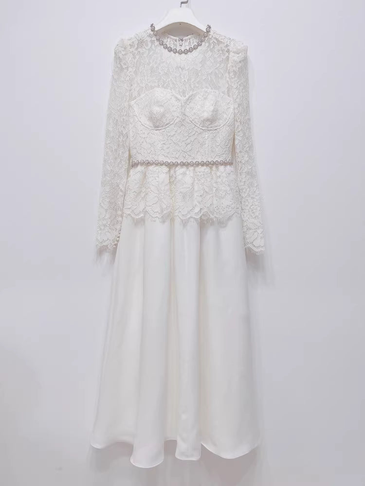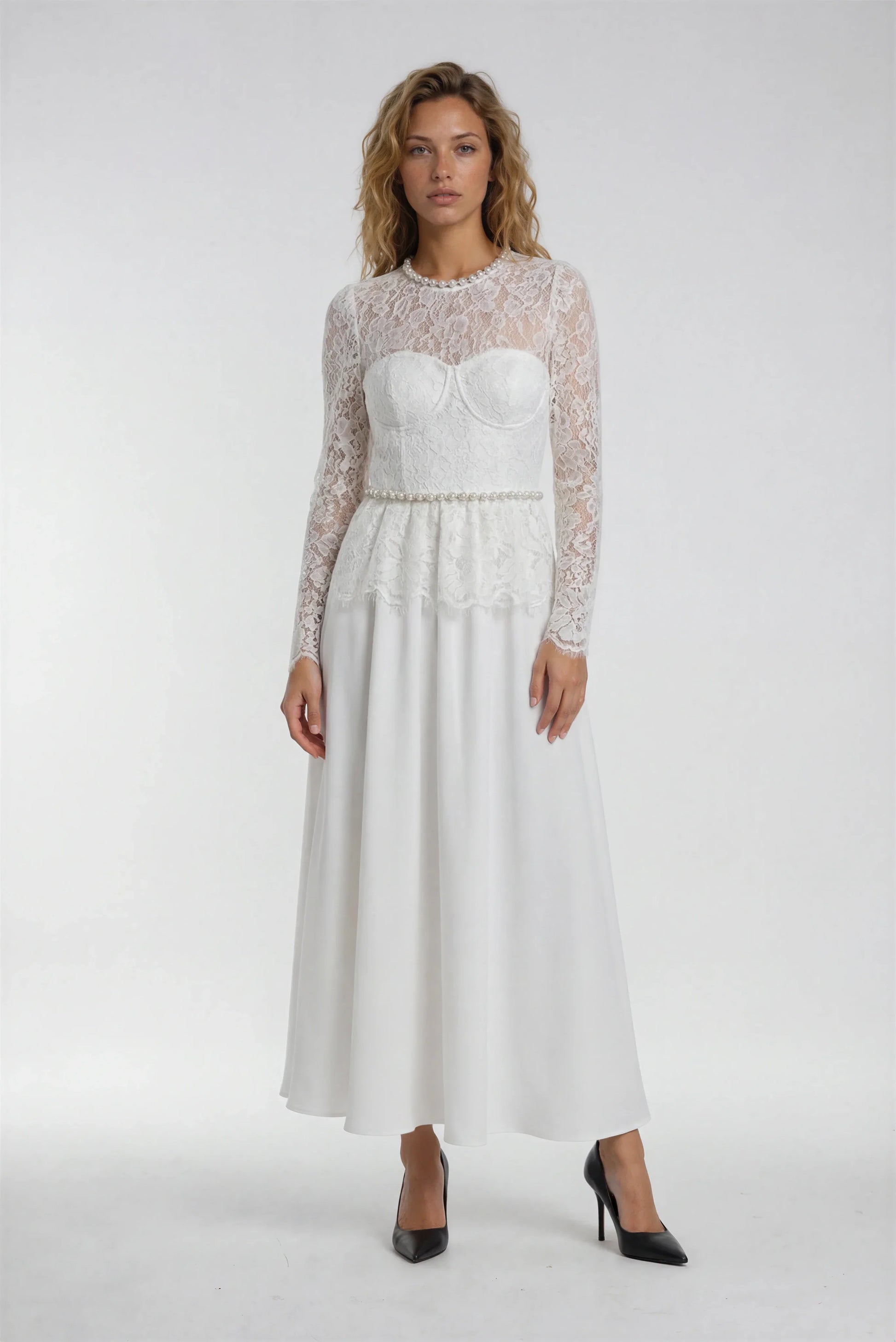 Zarafeti ve şıklığı aynı anda deneyimlemek isteyenler için tasarlandı. Dantel süslemeli polyester kumaşı, şık arka fermuarı ve göz alıcı inci kemeriyle dikkat çeken bu beyaz elbise, mükemmel bir görünüm sunar. Göğüsteki balenli yapı, iç astarı ve kullanışlı cepleriyle konforlu ve şık bir kullanım sağlarken, yüksek bel tasarımıyla vücut hatlarınızı zarifçe vurgular. Özel davetleriniz için unutulmaz bir seçim olacaktır.