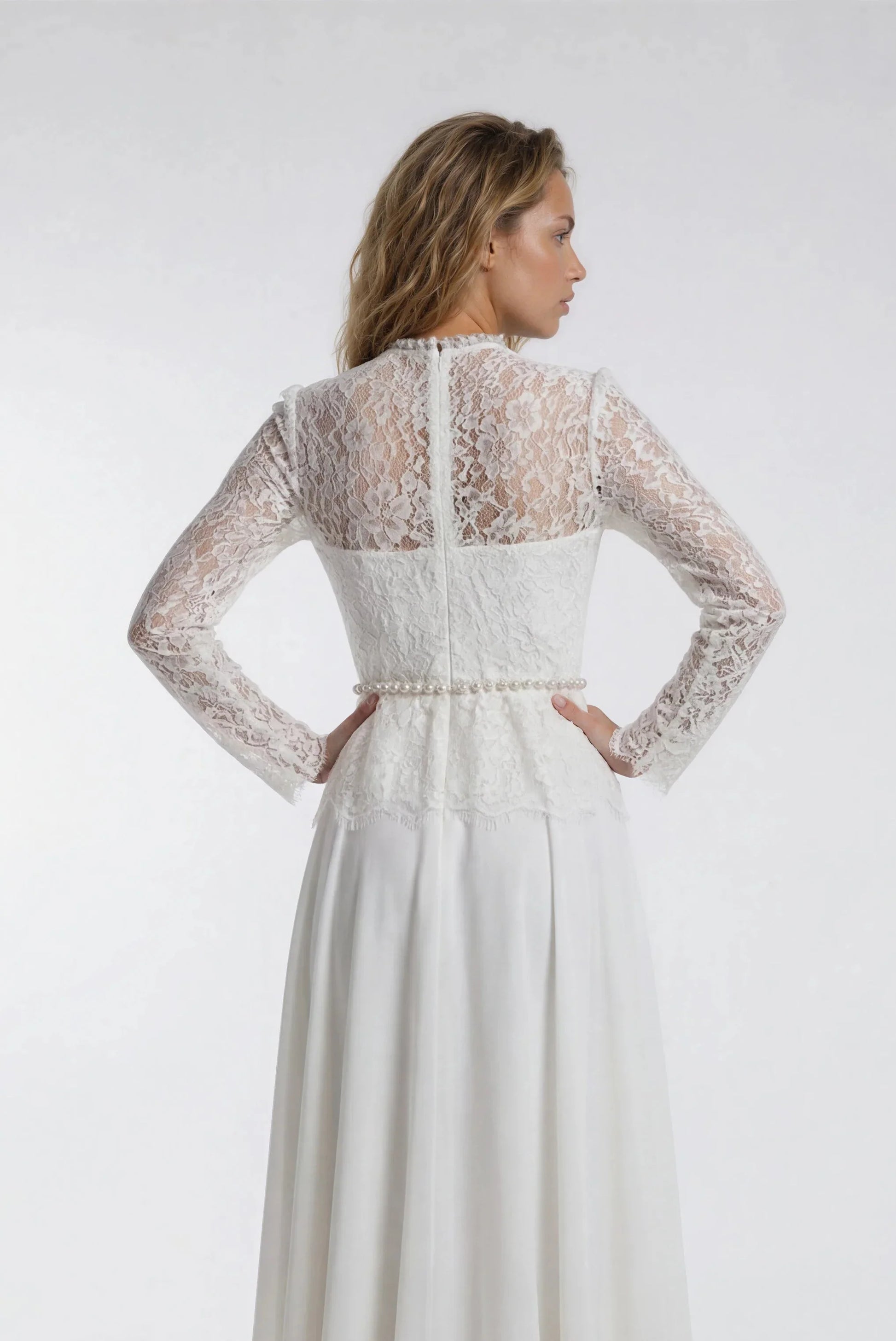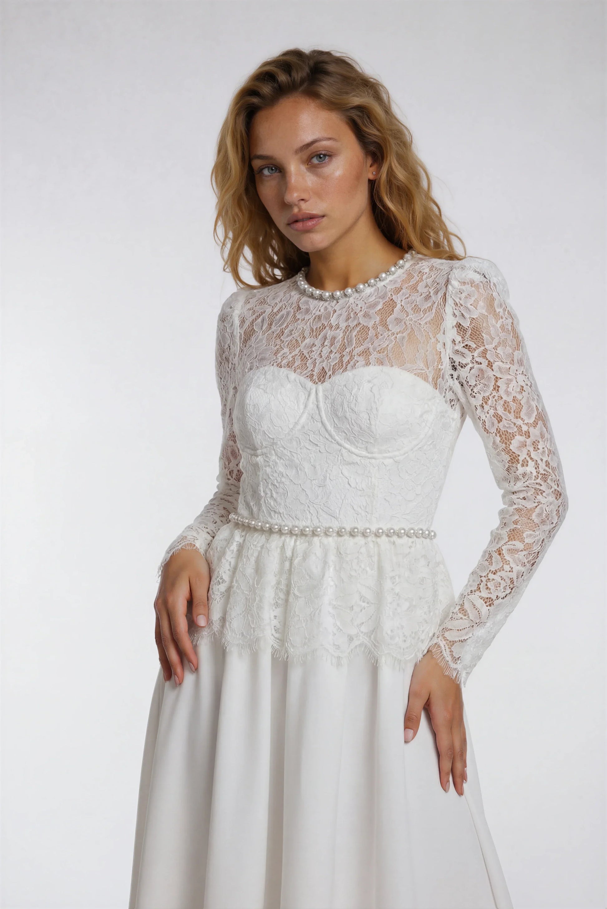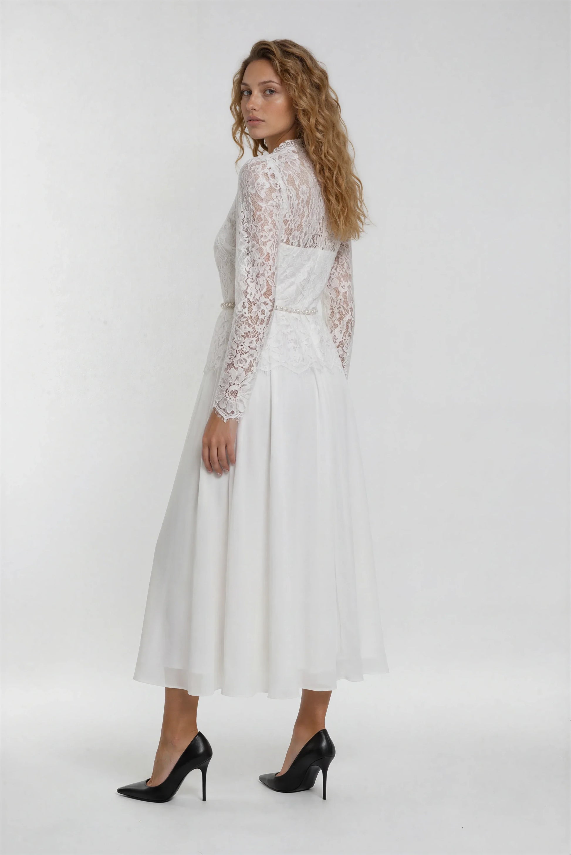 Zarafeti ve şıklığı aynı anda deneyimlemek isteyenler için tasarlandı. Dantel süslemeli polyester kumaşı, şık arka fermuarı ve göz alıcı inci kemeriyle dikkat çeken bu beyaz elbise, mükemmel bir görünüm sunar. Göğüsteki balenli yapı, iç astarı ve kullanışlı cepleriyle konforlu ve şık bir kullanım sağlarken, yüksek bel tasarımıyla vücut hatlarınızı zarifçe vurgular. Özel davetleriniz için unutulmaz bir seçim olacaktır.