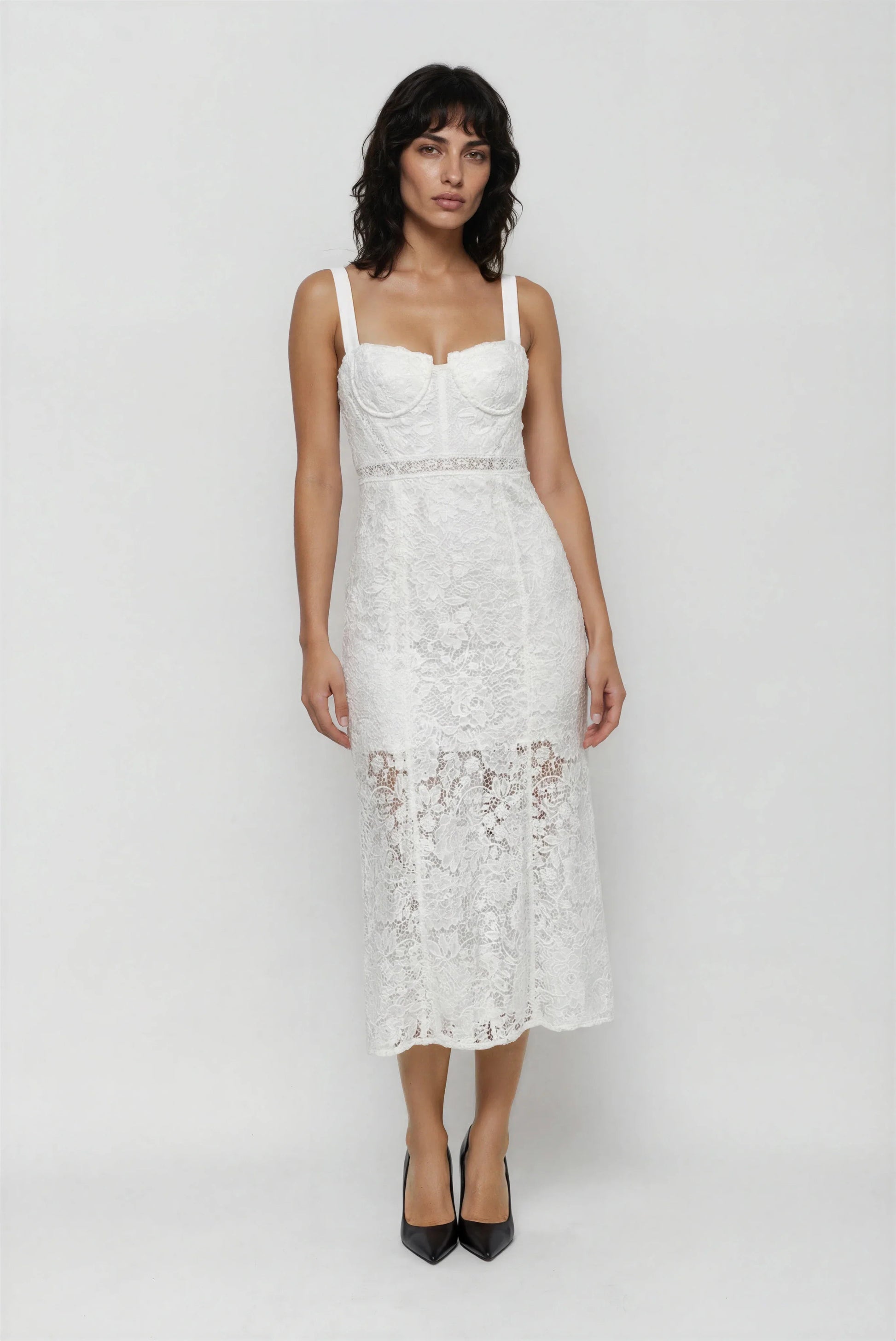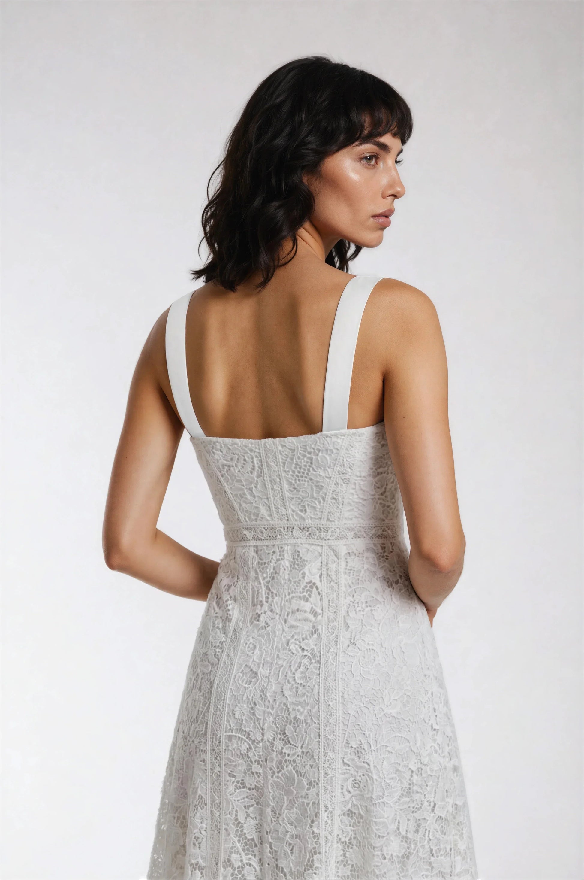 Bu elbise, özel yapım dantel işlemeleri ile saf beyaz rengi zarif bir uyumda buluşturuyor. Vücudu saran kesimi ve yüksek bel tasarımıyla temiz ve şık bir görünüm sağlar. Yan fermuarı ile kolay giyilip çıkarılırken, astarlı iç yapısı konforu artırır. El yapımı dantel detayları her elbiseye özgün bir karakter katar. Önemli Not: Bu ürün profesyonel bir kurum tarafından onaylanmamıştır.