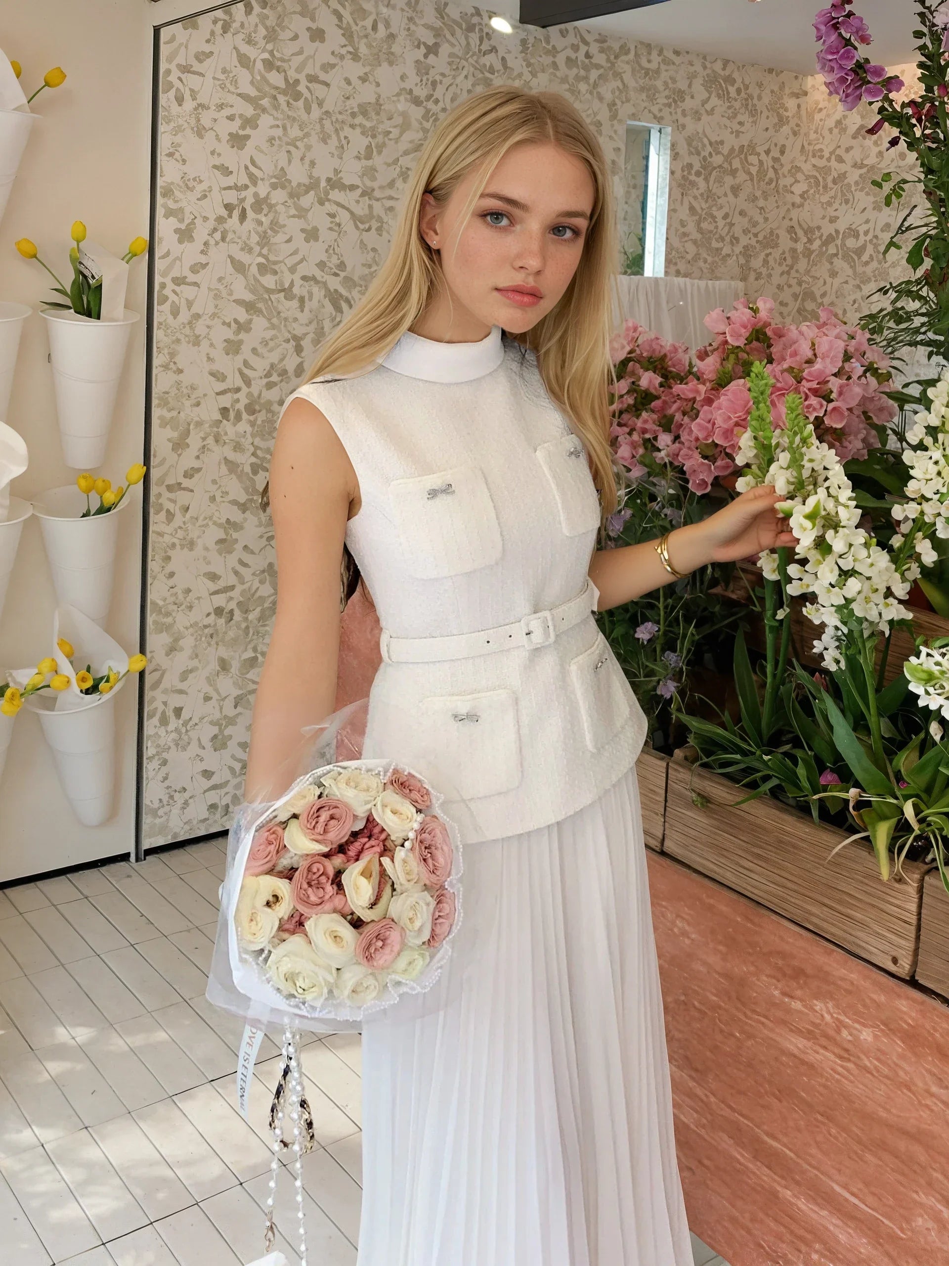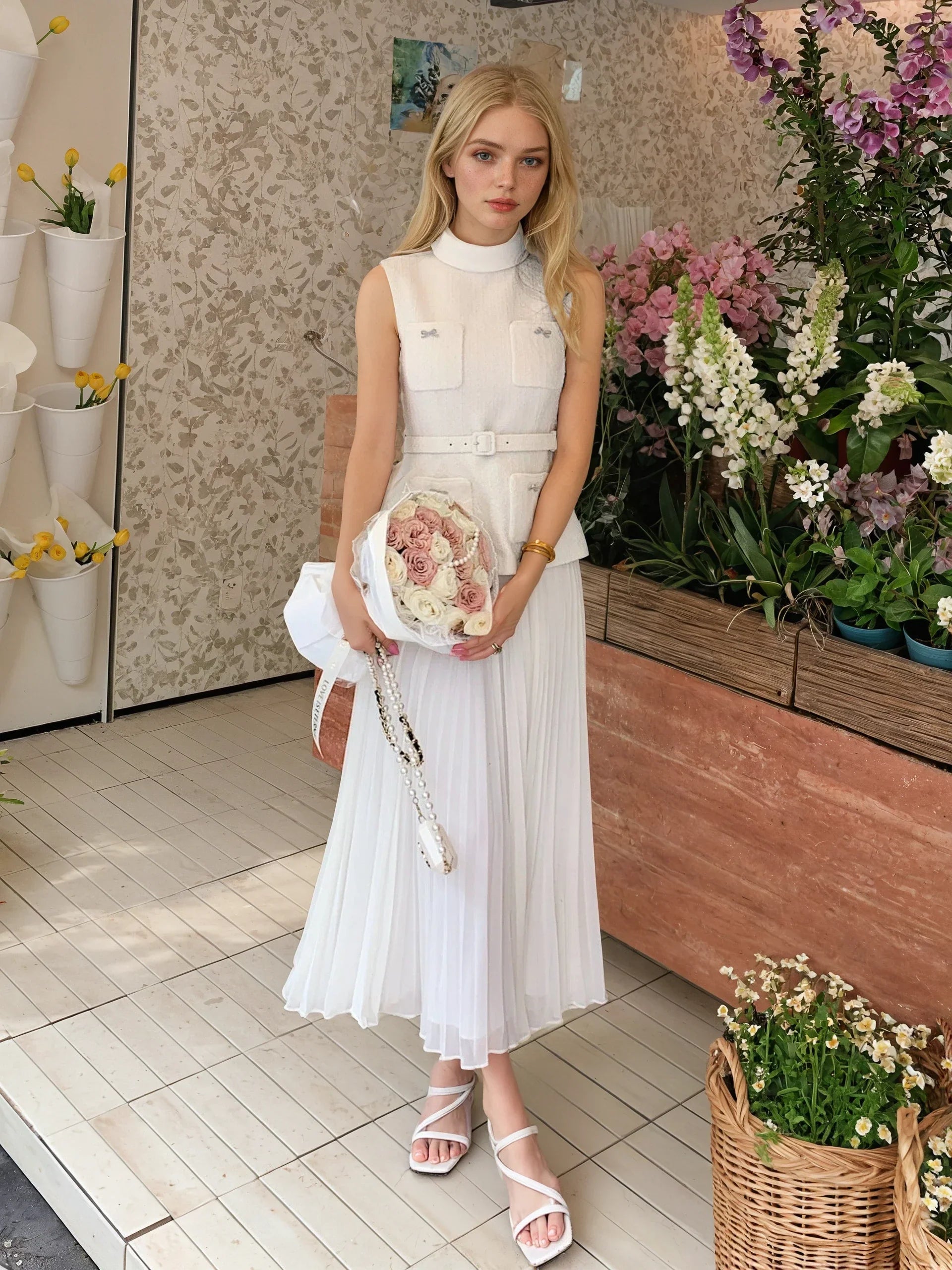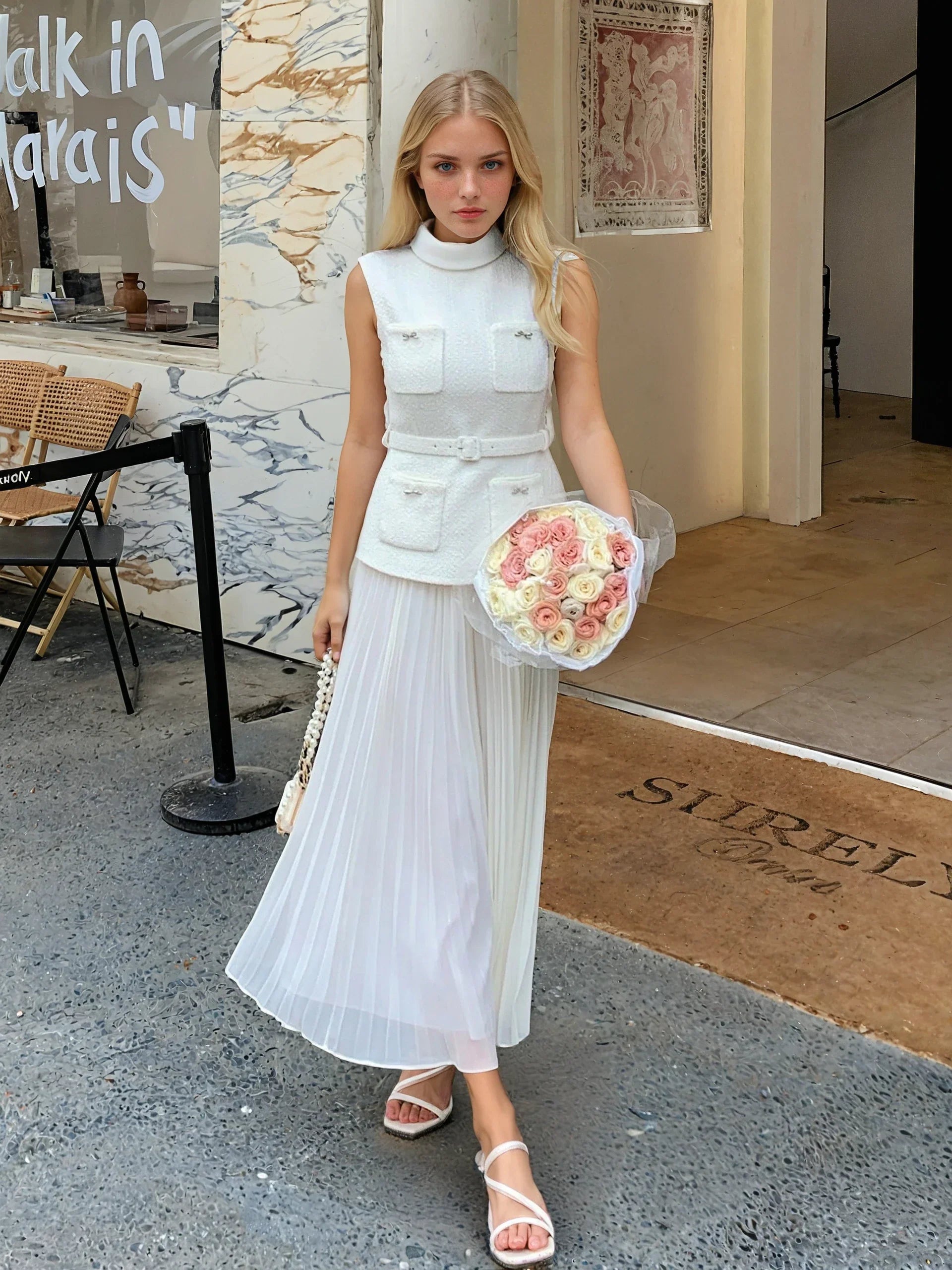 Zarif krem rengi ve tüvit-şifon karışımı kumaşın yarattığı hafif dokuyla dikkat çeken bu elbise, şık ve romantik bir tarz sunuyor. Yüksek bel tasarımı ve göğüs desteğiyle zarif bir görünüm vadeden model, kemer detayı, cepleri, arka fermuarı ve iç astarı ile konforlu bir giyim deneyimi sağlıyor. Özel günleriniz için klasik bir seçim.