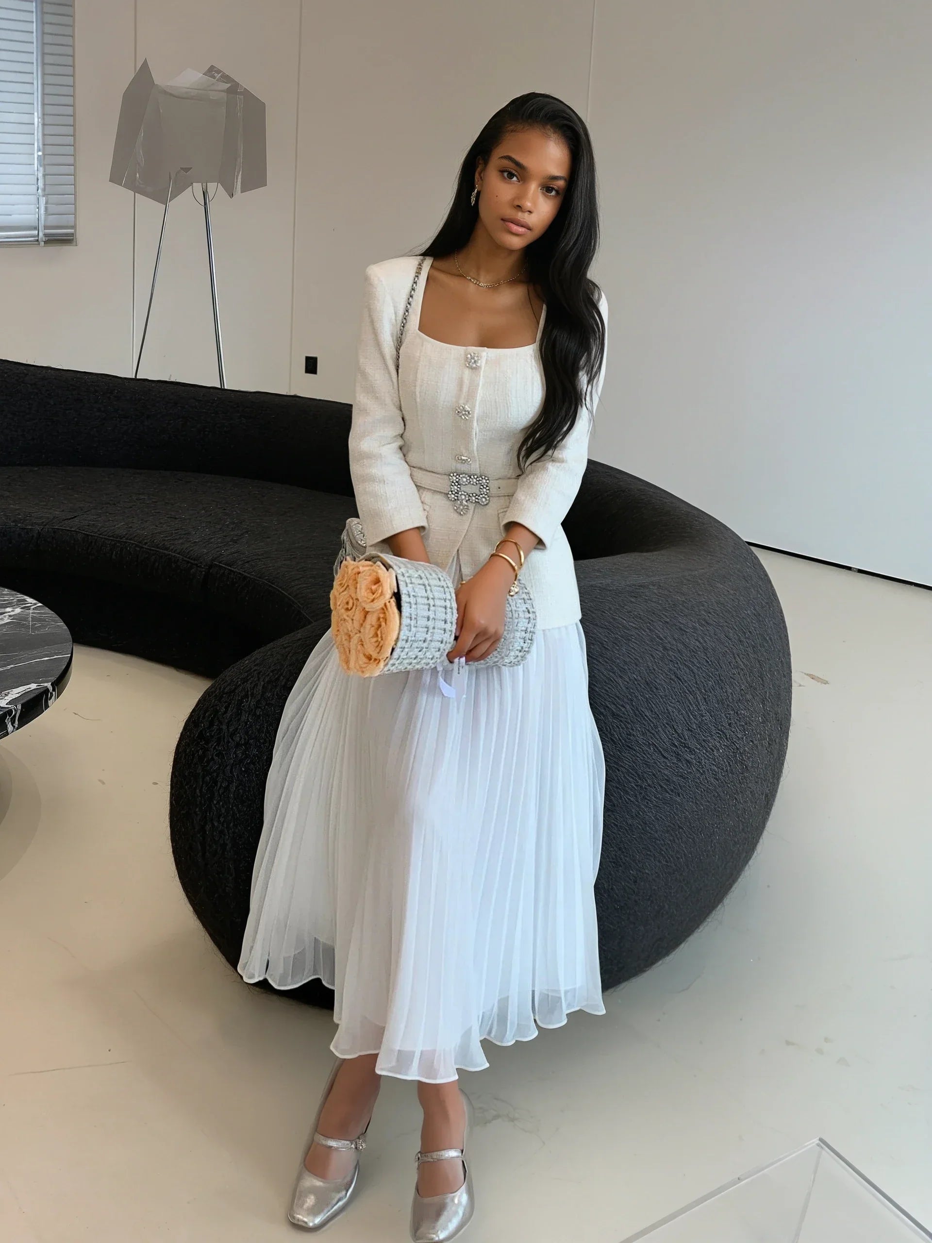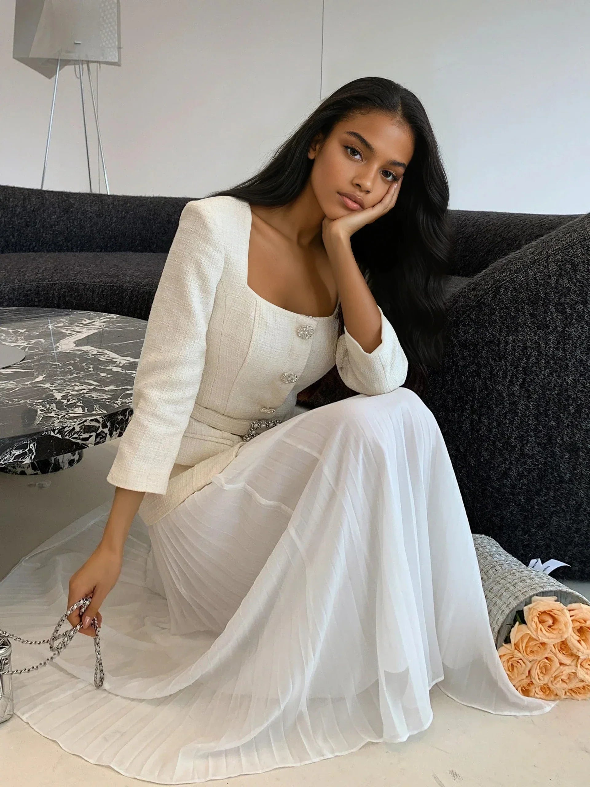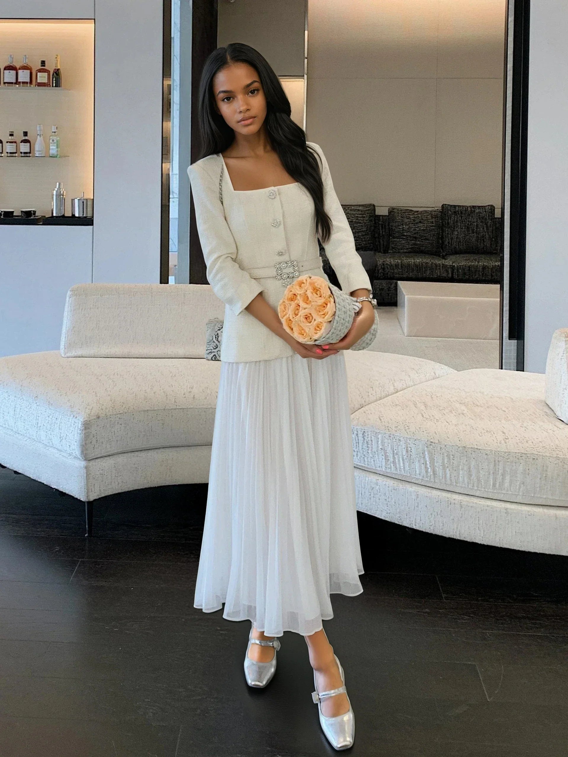 Kırık beyaz rengi ve zarif tüvit-şifon dokusuyla dikkat çeken bu elbise, romantik ve şık bir tarz sunuyor. Yüksek bel tasarımı ve kemer detayı ile vücut hatlarınızı öne çıkarırken, çıtçıtlı ön kısmı ve cepleri pratik bir kullanım sağlar. Astarlı yapısı konforu artırıyor.