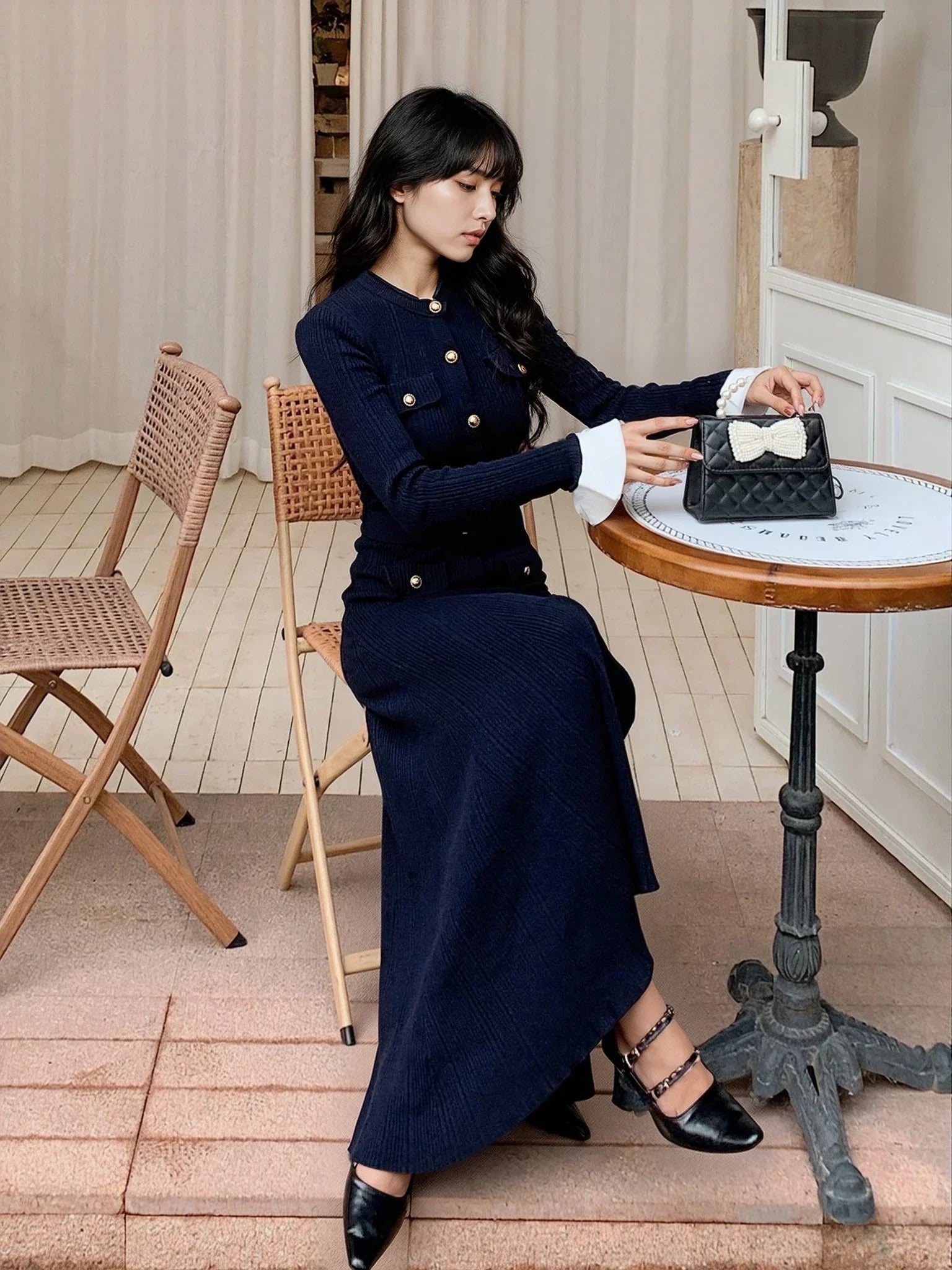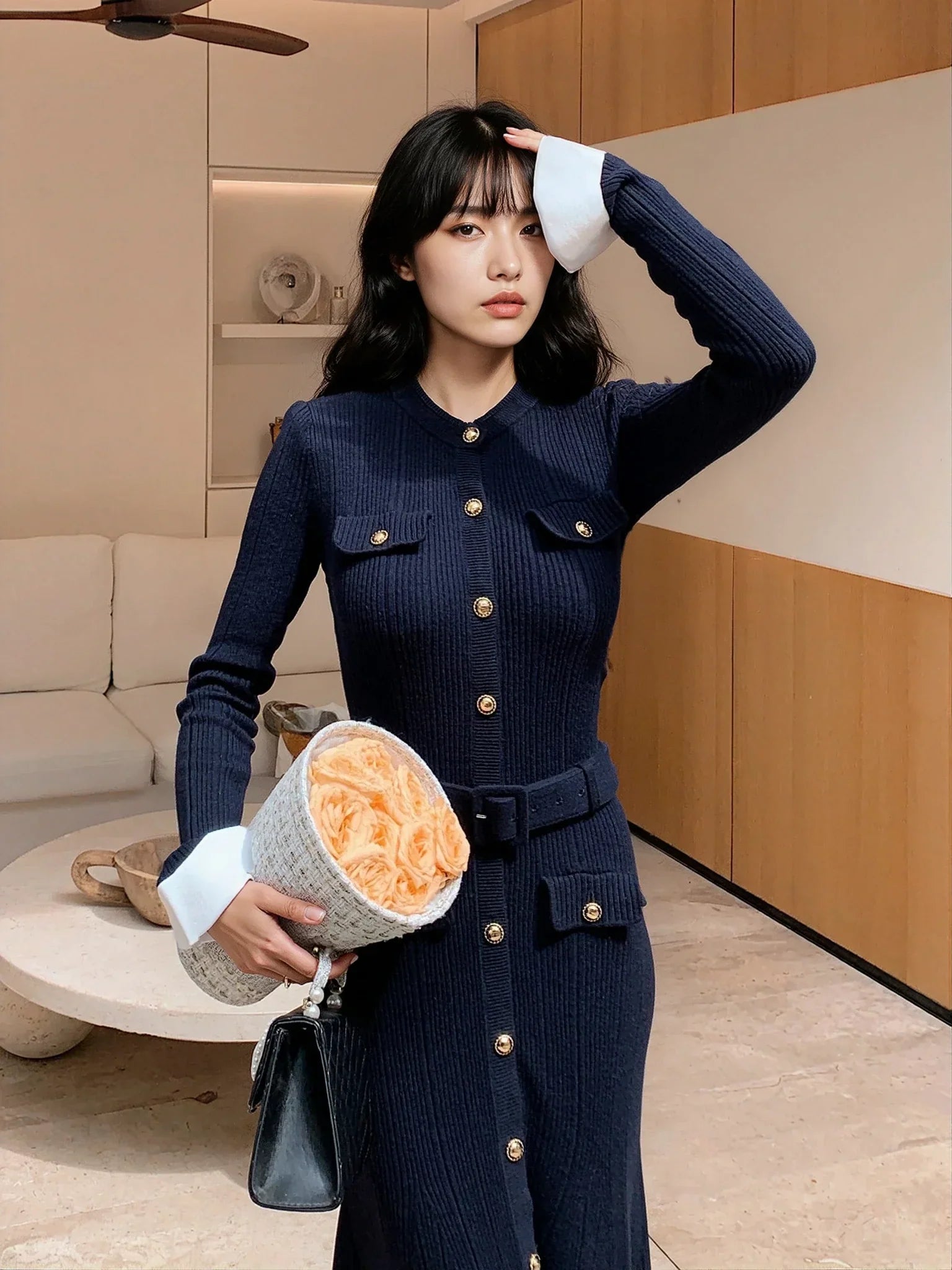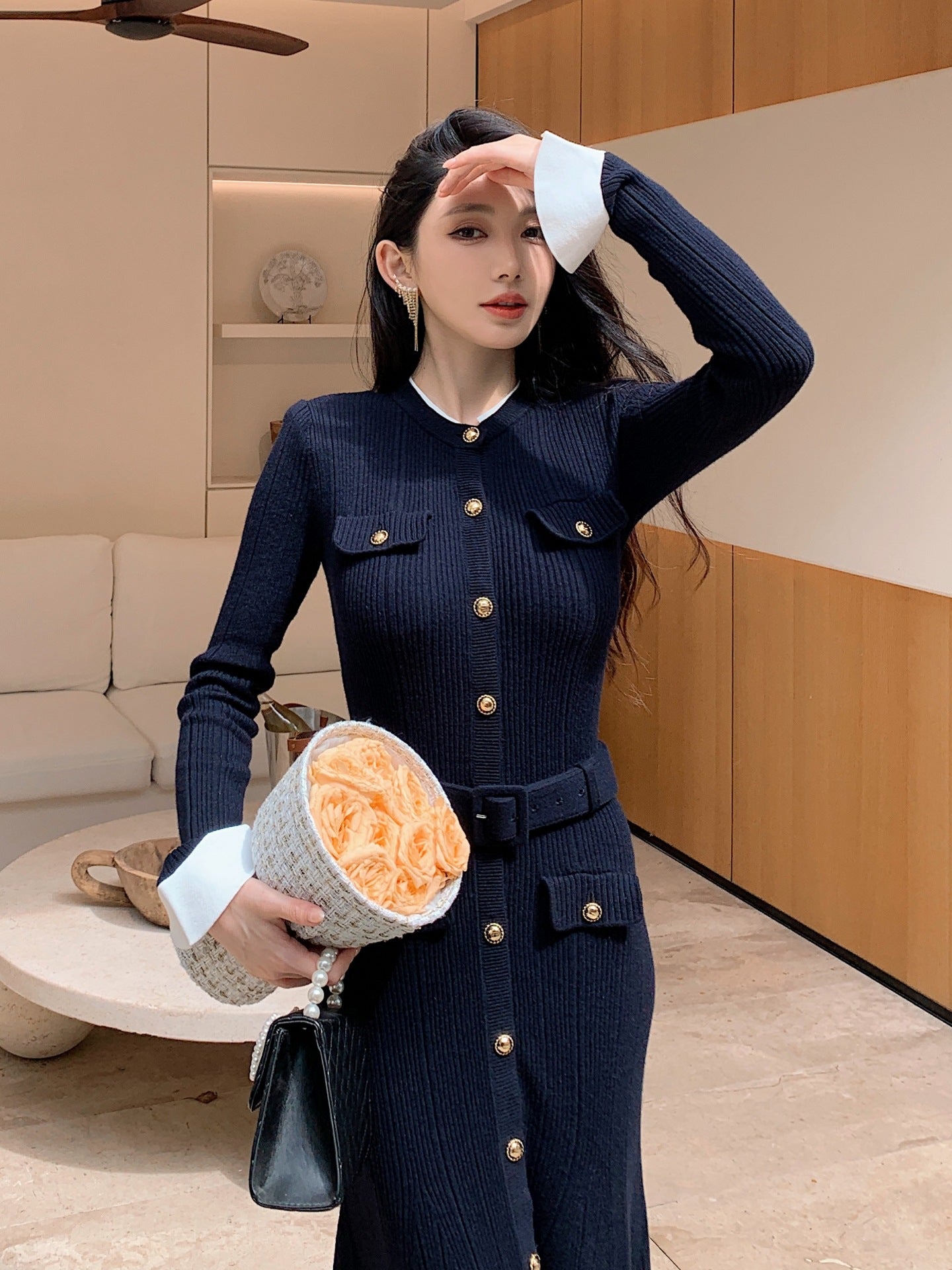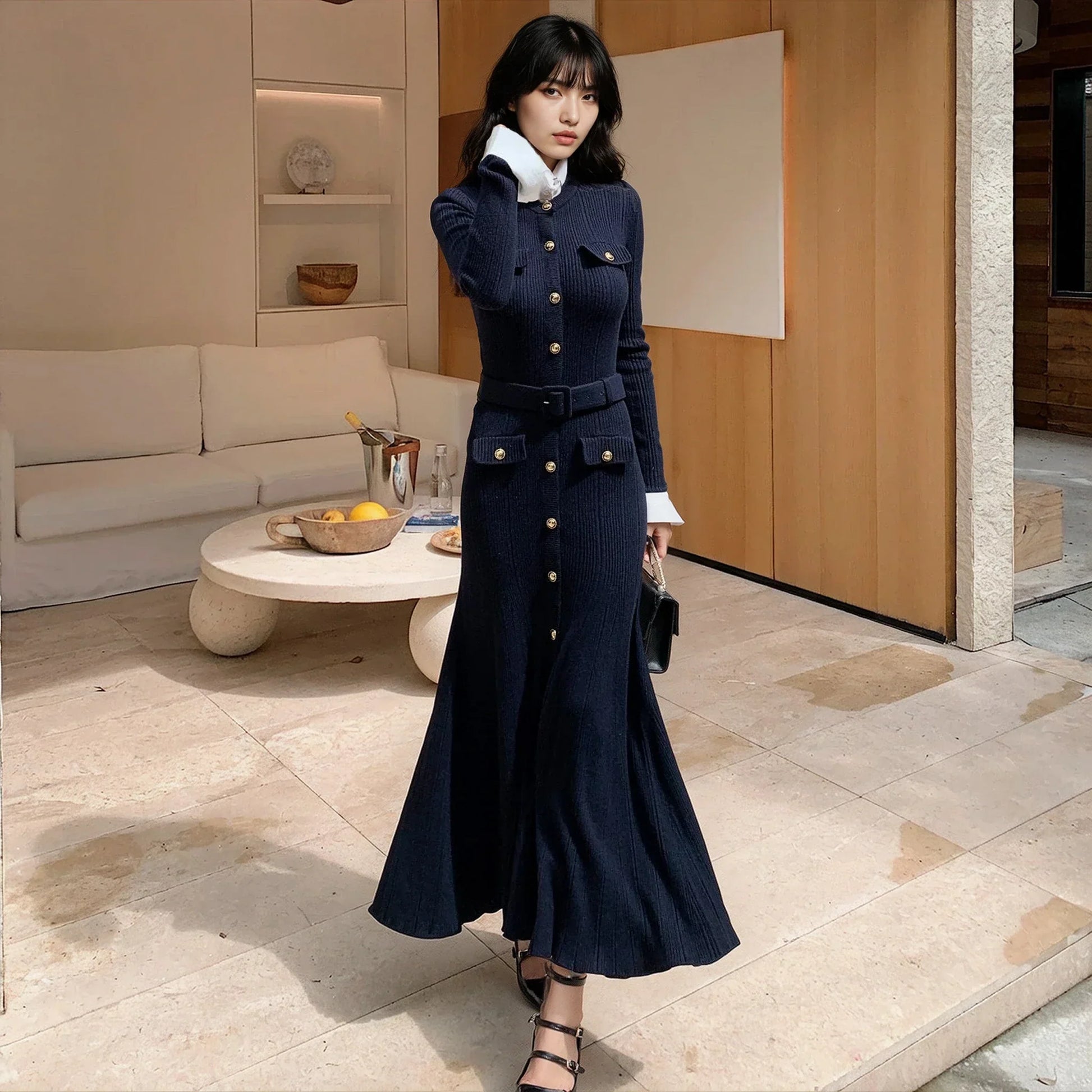 Rahatlığı ve şıklığı dengeli bir şekilde sunan bu lacivert örgü elbise, yüksek bel tasarımı ve streç kumaşıyla mükemmel bir uyum sağlar. Düğmeli pat detayı, kemeri, cepleri ve çıkarılabilir omuz pedleri ile birçok farklı tarza uyum sağlayacak çok yönlü bir parça.