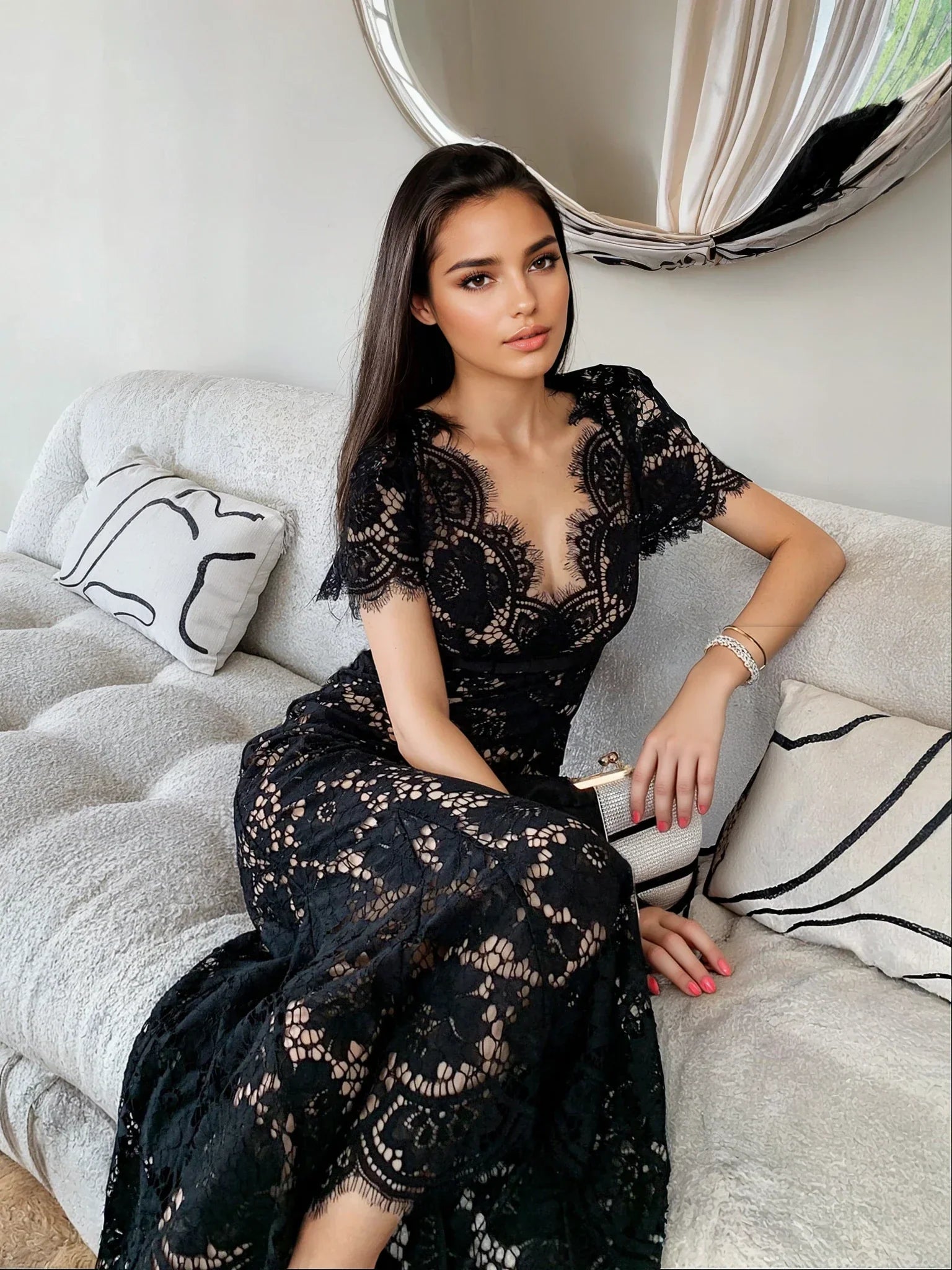 Zarif kirpik dantel işçiliği ve klasik siyah rengiyle şıklığı yakalayan bu elbise, romantik ve sofistike bir tarz sunuyor. Yüksek bel tasarımı ve göğüs bölgesindeki rahat kesimiyle şık bir görünüm vadeden model, orta fermuarı ve askılı iç astarı ile konforlu bir giyim deneyimi sağlıyor. Özel günleriniz için unutulmaz bir seçim.