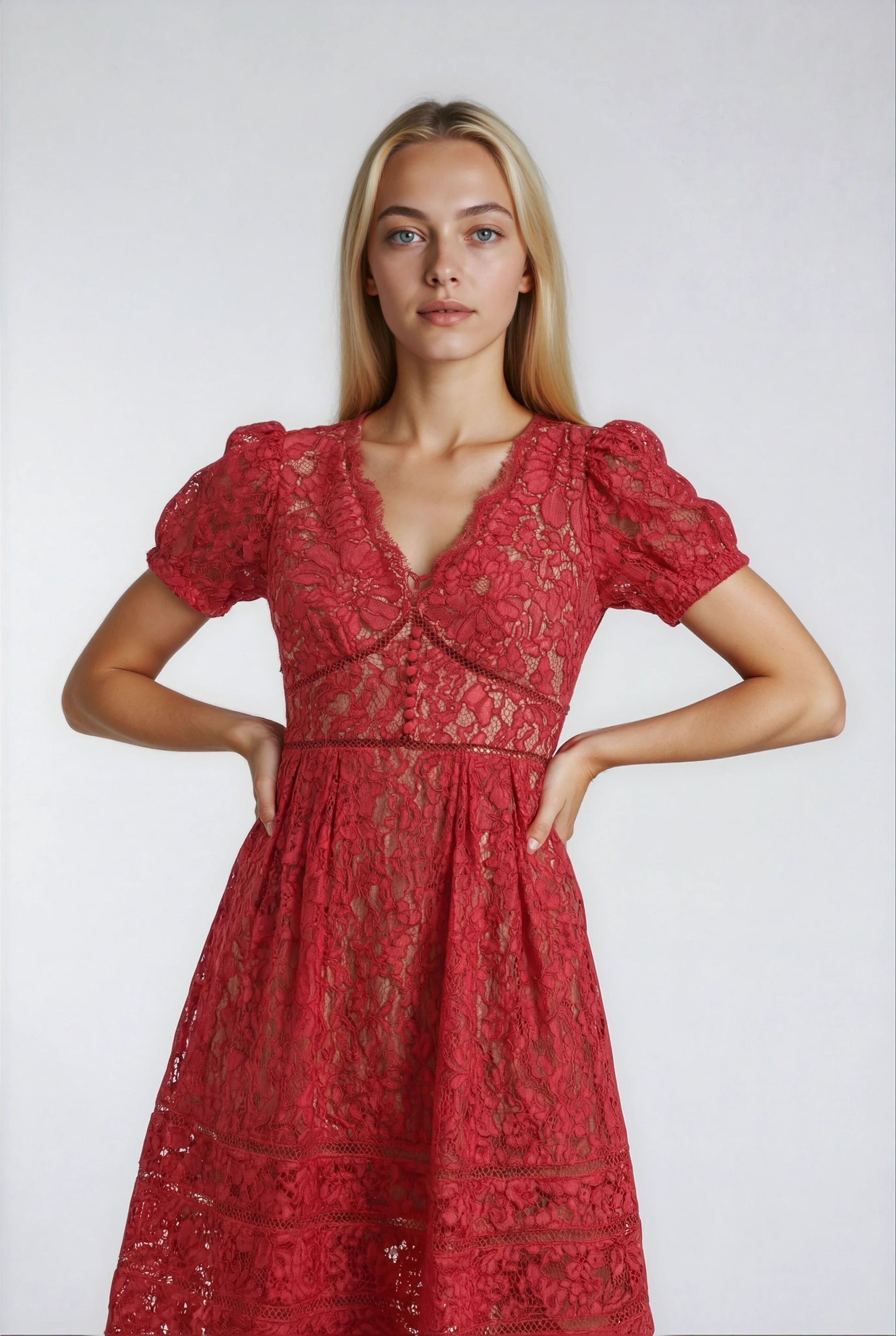 Romantizmi ve şıklığı aynı anda deneyimlemek isteyenler için tasarlandı. Kirpik dantel işçiliği, iç astarı ve şık arka fermuarıyla dikkat çeken bu kırmızı/mavi elbise, zarif bir görünüm sunar. Pratik cepleri ve yüksek bel tasarımıyla vücut hatlarınızı mükemmelleştirir, özel günleriniz için unutulmaz ve büyüleyici bir seçim olacaktır.