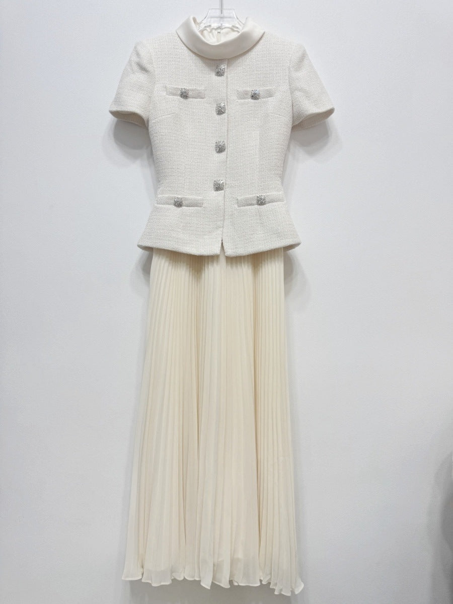 Kırık beyaz rengi ve şık patchwork detaylarıyla dikkat çeken bu tüvit elbise, yüksek bel tasarımıyla zarif bir görünüm sunuyor. Astarlı yapısı, arka fermuarı, kullanışlı cepleri ve omuz vatkaları ile hem görünüm hem de konfor sağlıyor. Göğüs bölgesindeki esnek tasarım hareket özgürlüğü verir.
