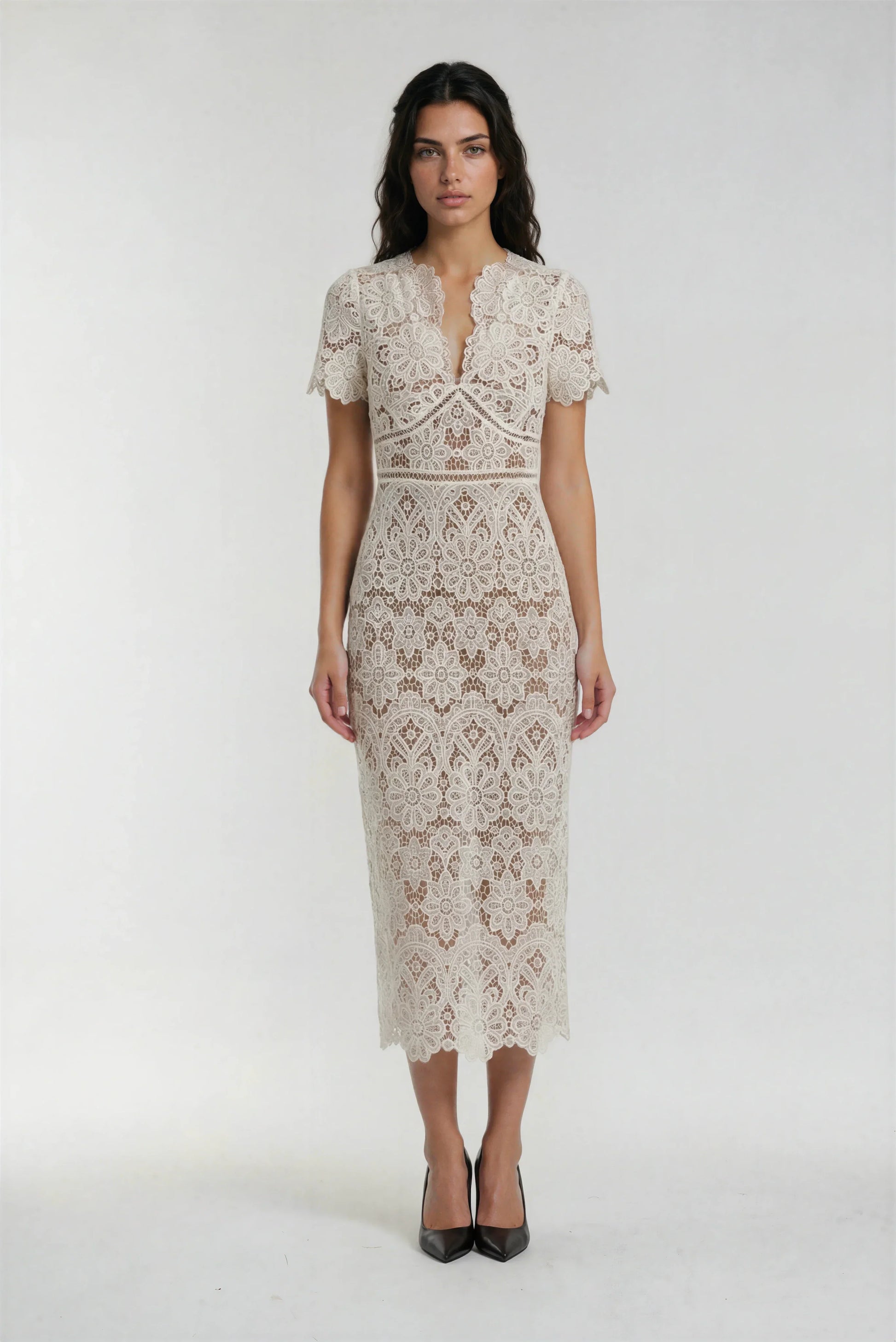 Bu krem rengi elbise, özel dantel dokusu ve ortadan fermuar detayıyla zarafeti vurguluyor. Yüksek bel tasarımı ve dar kesimiyle vücudu saran şık bir görünüm sunar. Özel günleriniz için büyüleyici ve romantik bir seçim olacaktır.