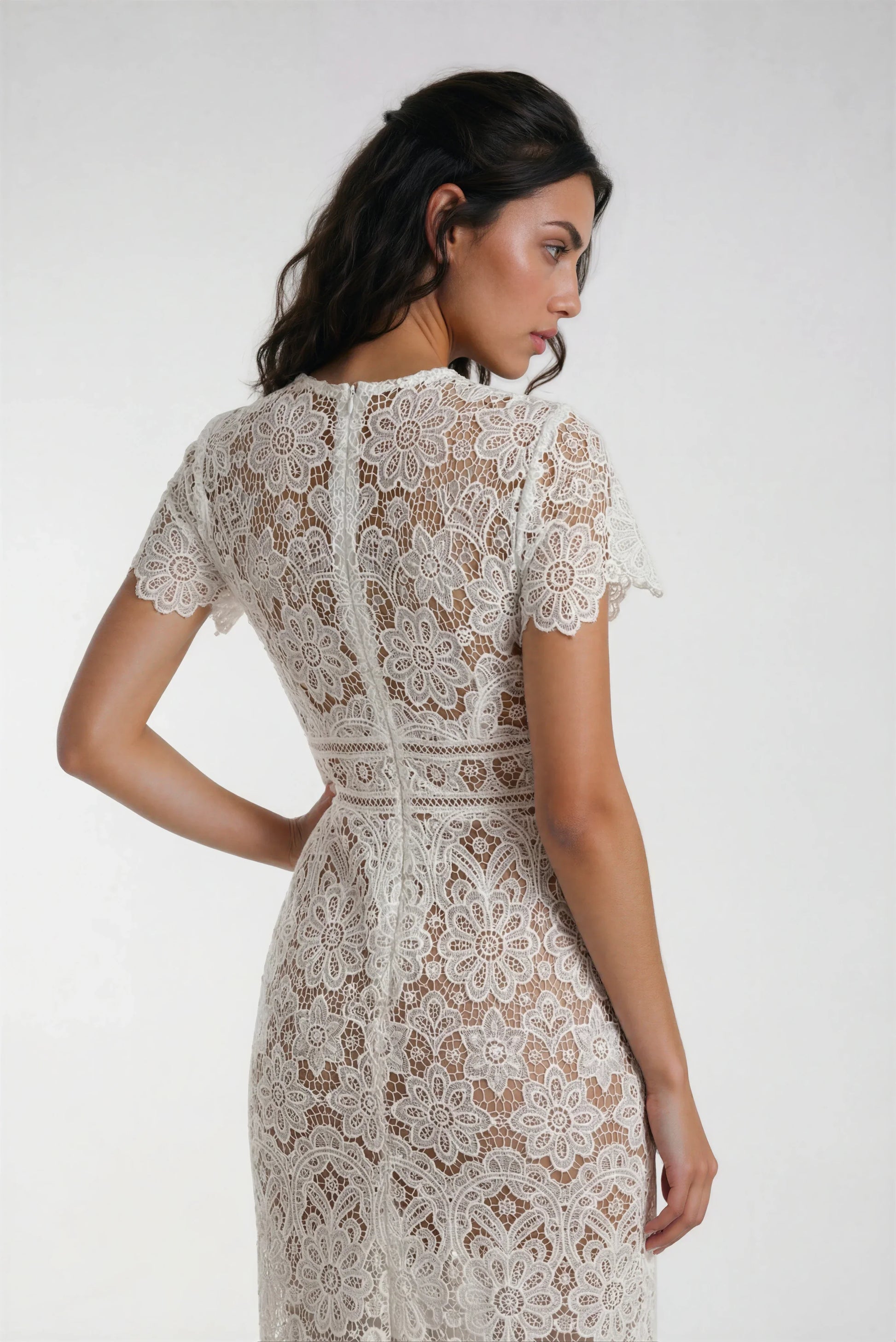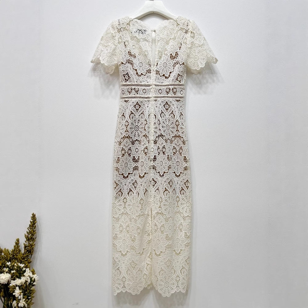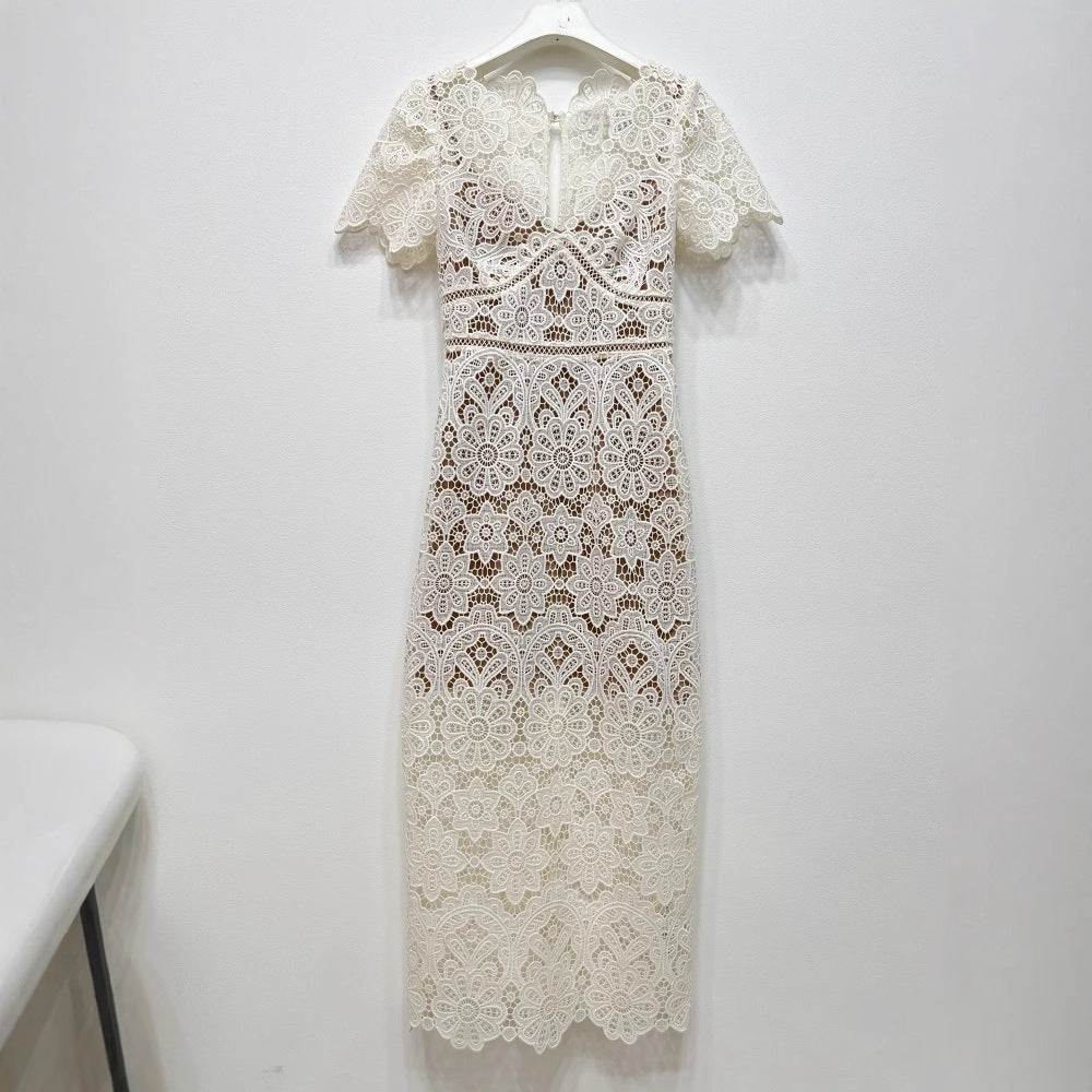 Krem Ortadan Fermuarlı Dantel Elbise