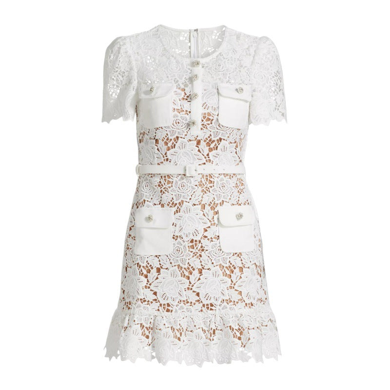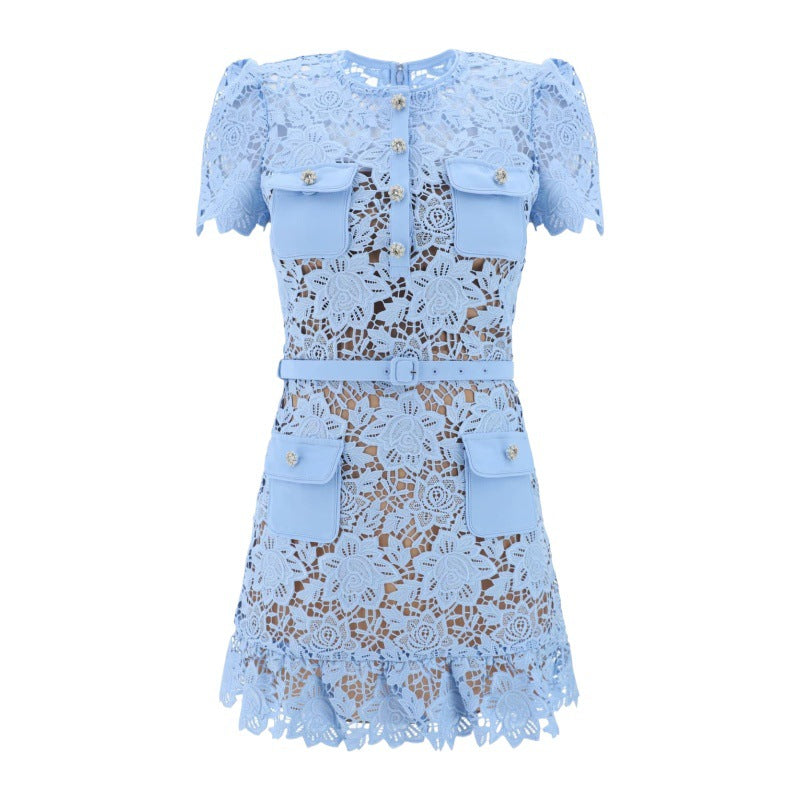 Zarif dantel işçiliği ve temiz açık mavi/beyaz renkleriyle büyüleyen bu elbise, romantik ve şık bir tarz sunuyor. Yüksek bel tasarımı ve göğüs desteğiyle zarif bir görünüm vadeden model, çıtçıt düğmeleri, kemer detayı, cepleri ve arka fermuarı ile tamamlanıyor. İç astarı konforu artırıyor.