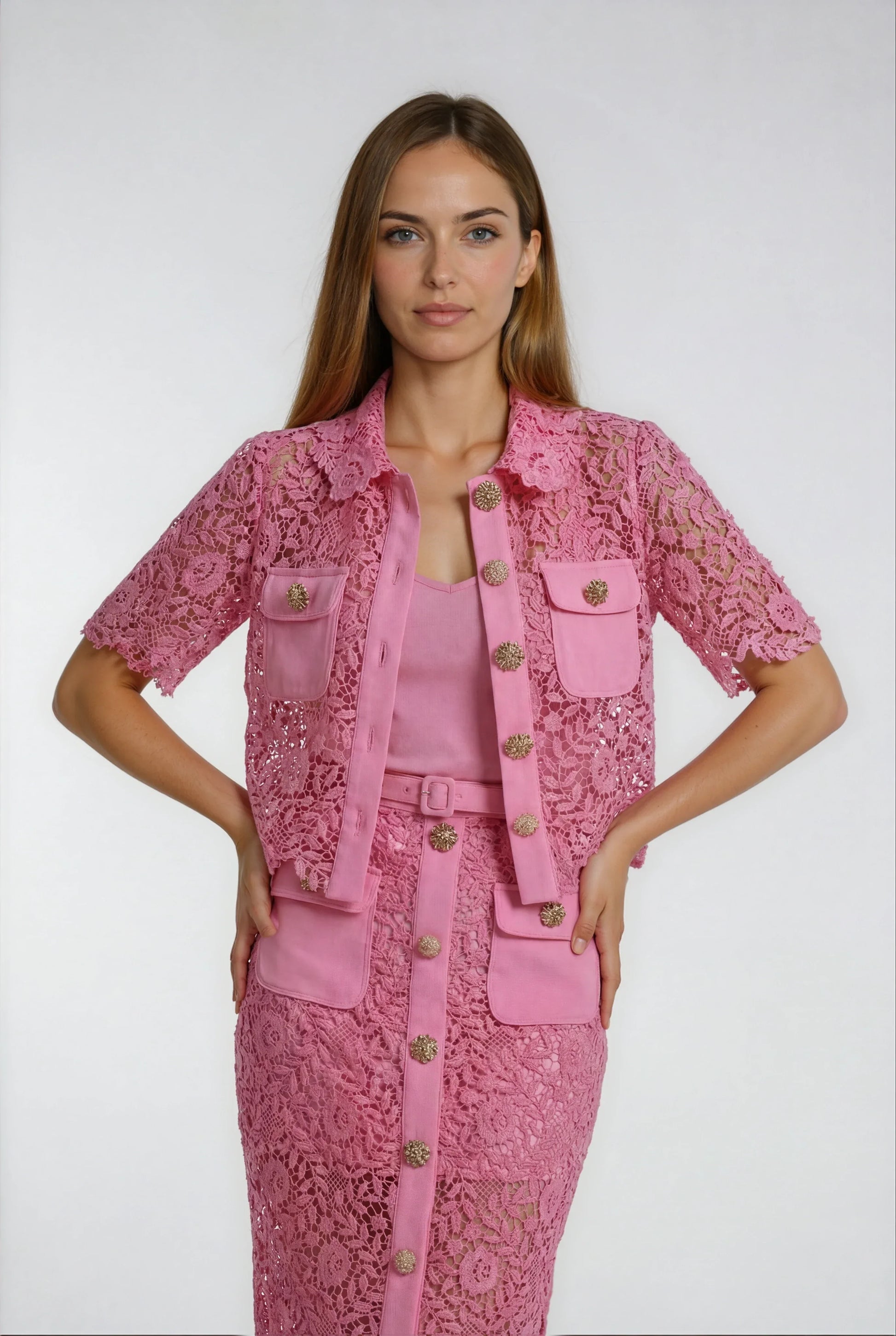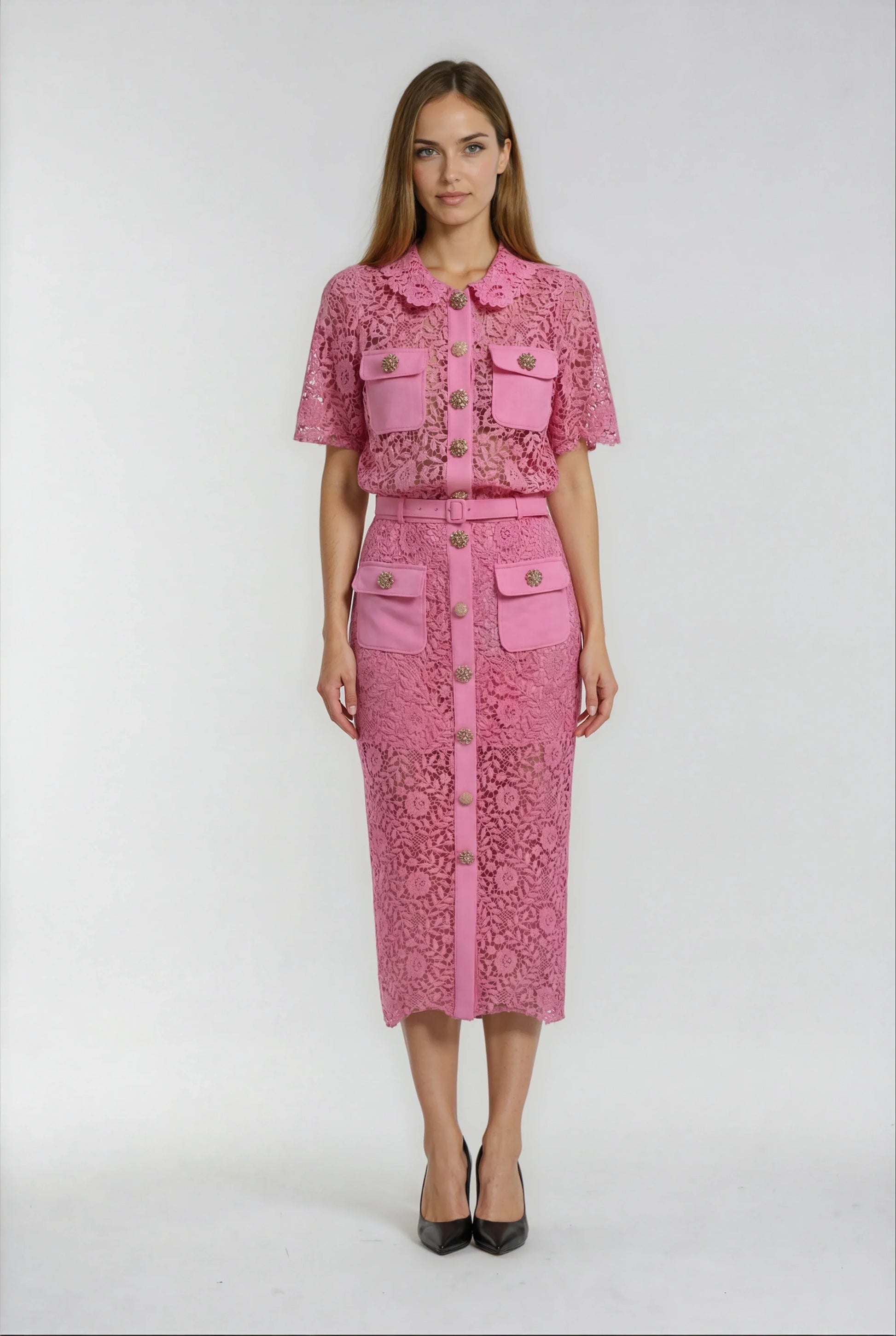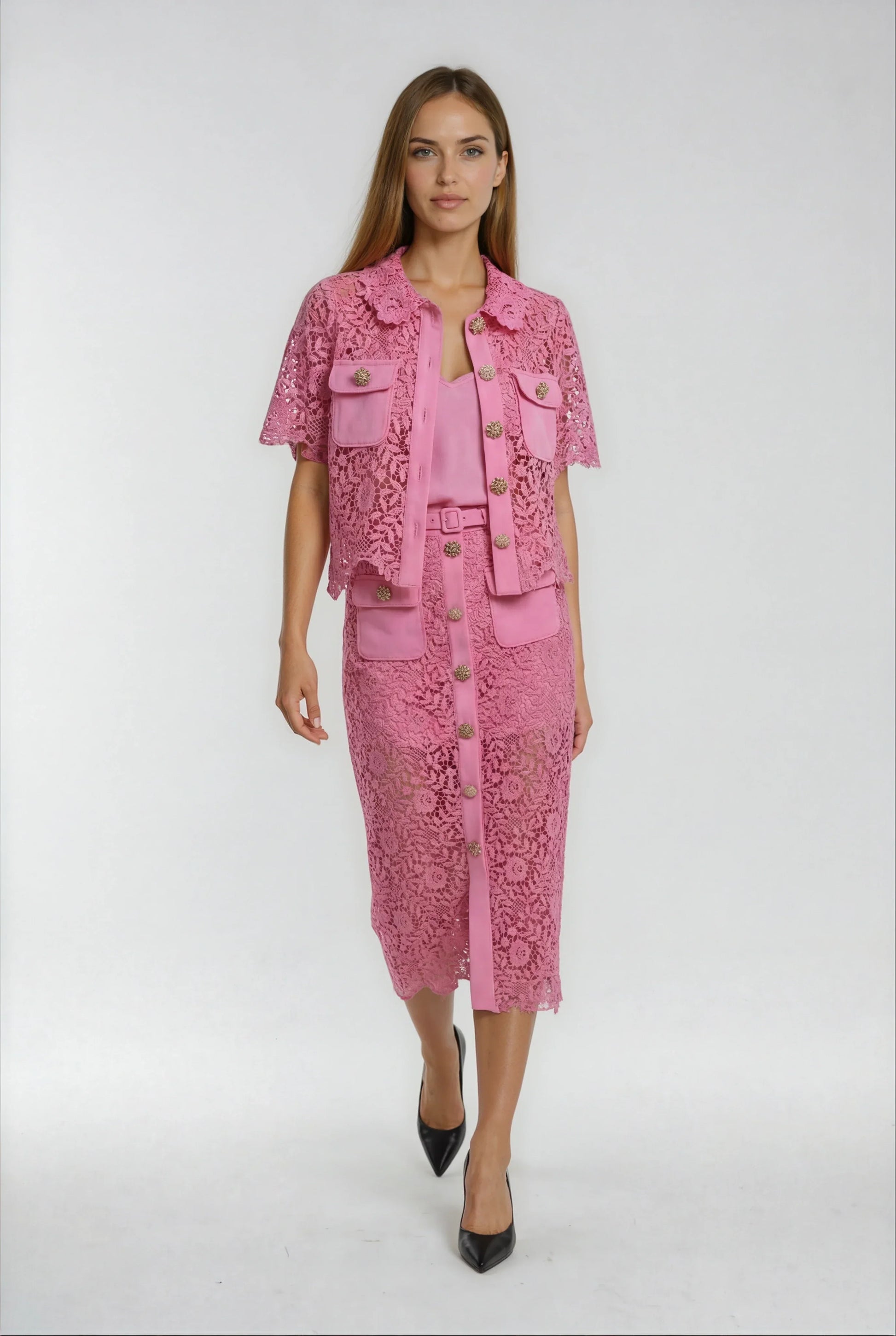 Bu etek, zarif dantel süslemeleri ve romantik pembe rengiyle şık bir görünüm sunuyor. Yüksek bel tasarımı ve yan fermuarı ile vücudu sararak dengeli bir siluet oluşturur. Yanında verilen kemerle belinizi vurgulayabilirsiniz. Dantel işçiliğinin el yapımı dokusu, her eteğe özgün bir karakter katar.