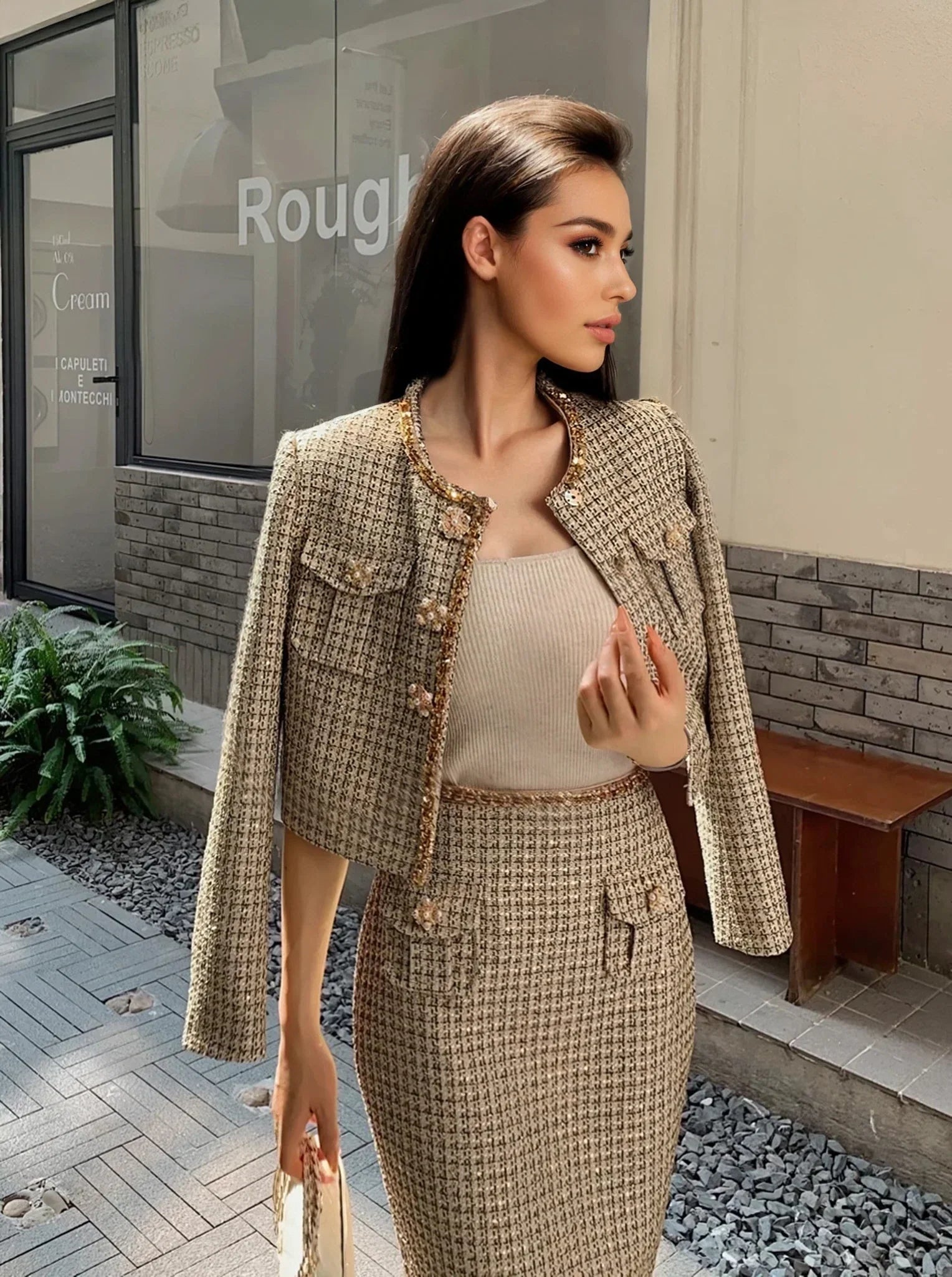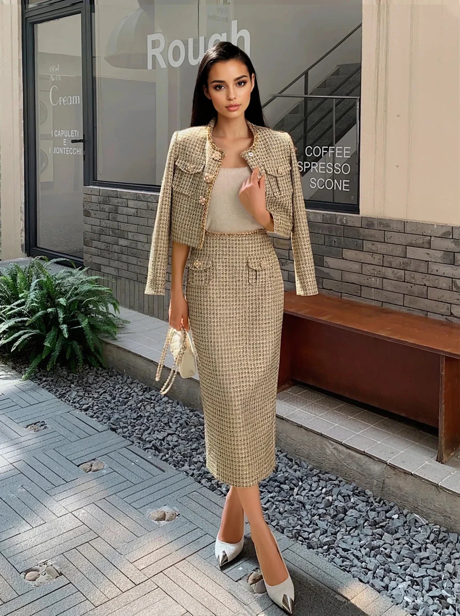 Işıltılı altın rengi ve göz alıcı payetli tüvit kumaşıyla dikkat çeken bu etek, şık ve zarif bir tarz sunuyor. Yüksek bel tasarımıyla şık bir görünüm vadeden model, arka fermuarı ve iç astarı ile konforlu bir giyim deneyimi sağlıyor. Üzerine farklı bluz ve ceketlerle kolayca kombinlenebilir, özel günleriniz için mükemmel bir tamamlayıcı.