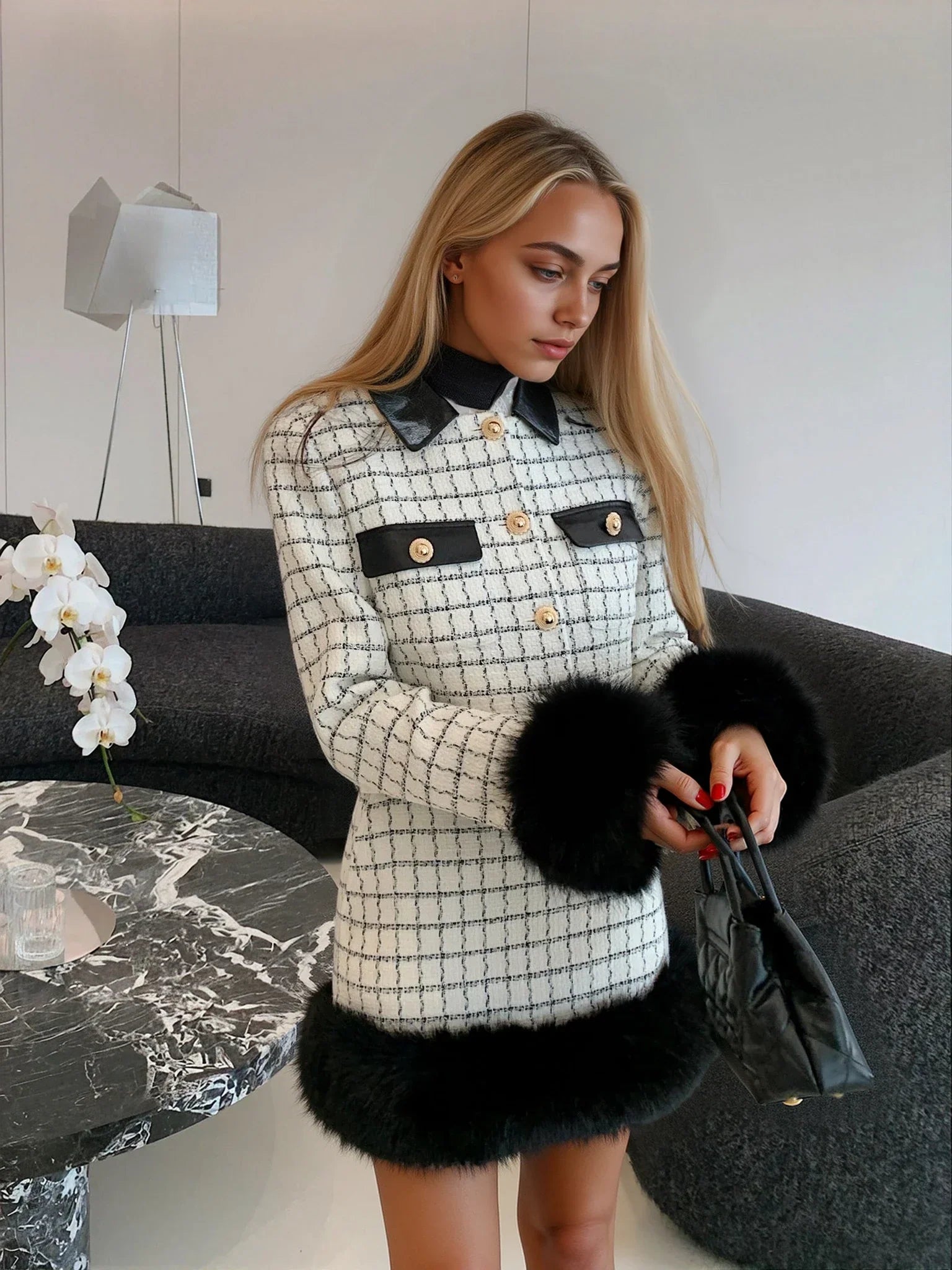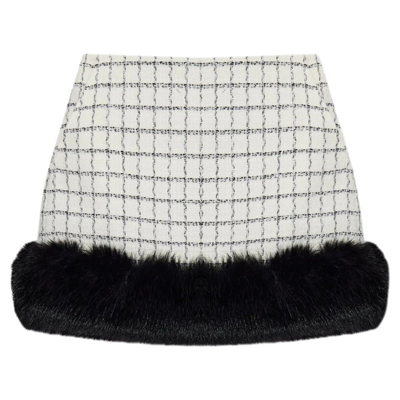 Beyaz Kareli Kürklü Yaka Etek