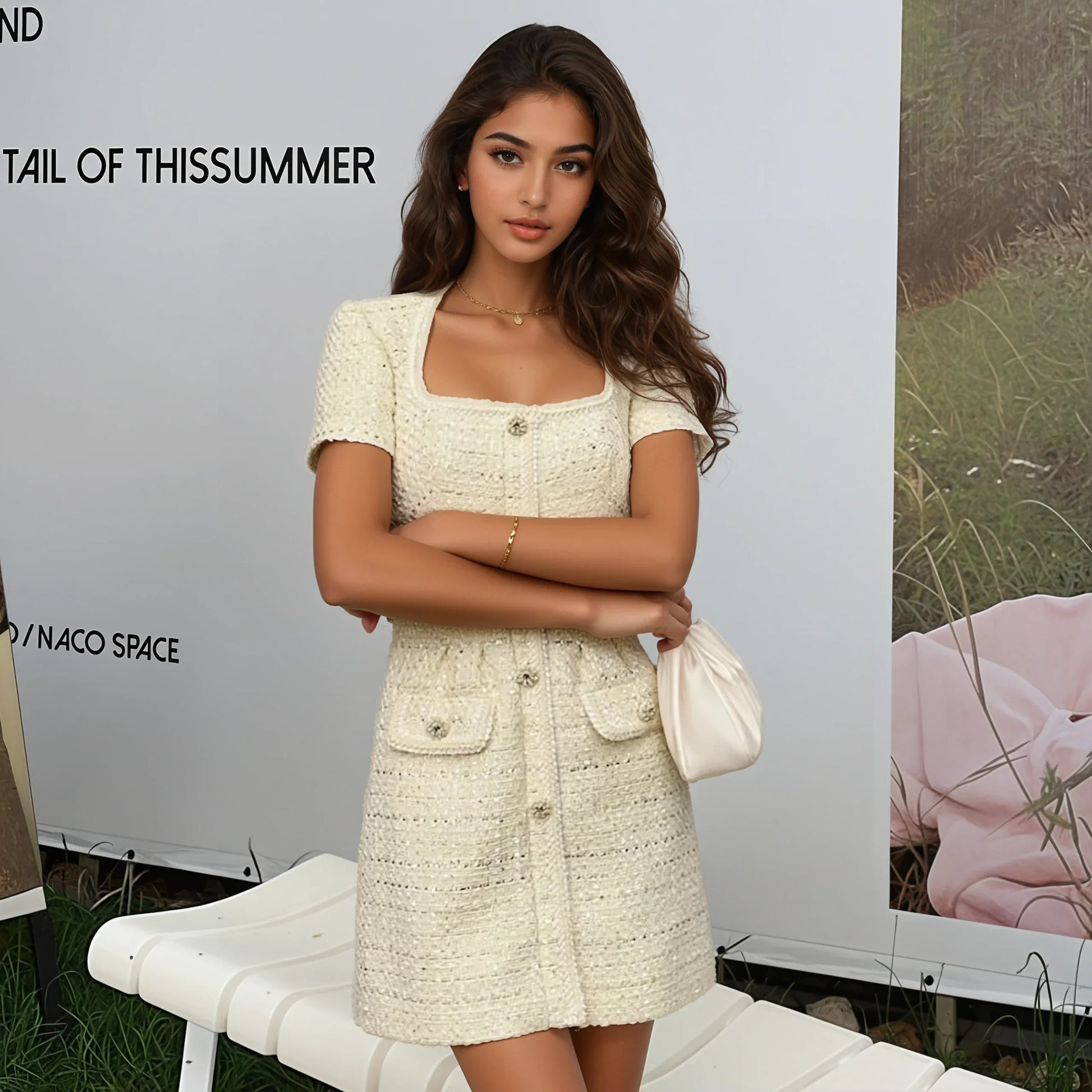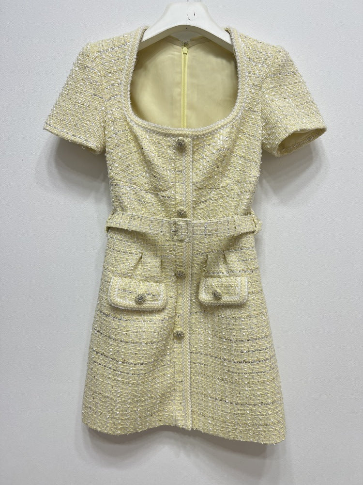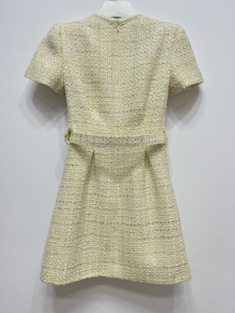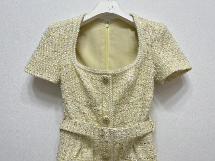 Bu limon sarısı tüvit elbise, canlı rengi ve şık tasarım detaylarıyla dikkat çekiyor. Yüksek bel kesimiyle zarif bir görünüm sunarken, arka fermuarı, kemeri ve kullanışlı cepleriyle pratik bir kullanım sağlar. İç astarı sayesinde konforlu bir giyim deneyimi vadeden bu elbise, hem günlük hem de özel gün kombinlerinize neşeli bir dokunuş katacak.