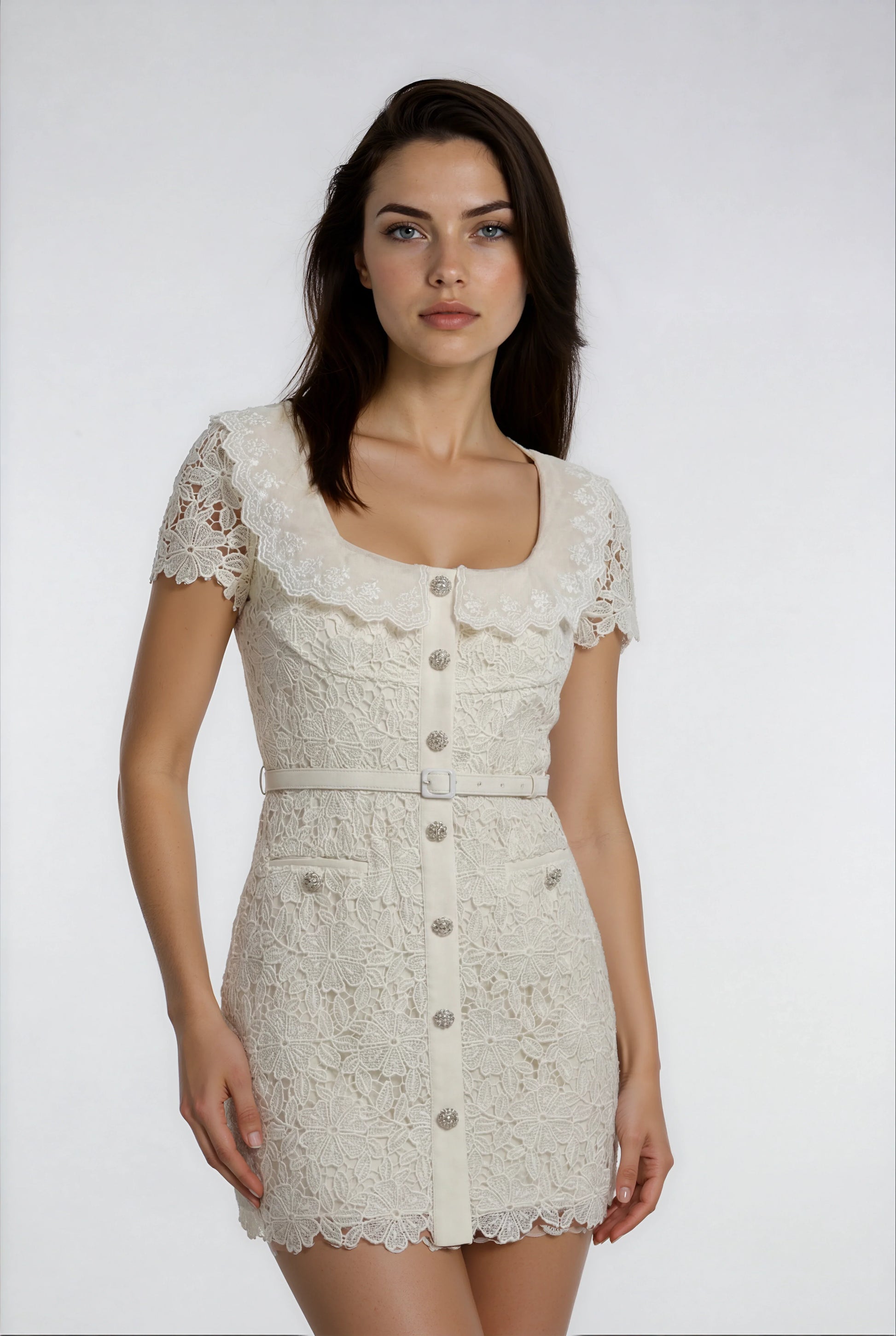 Bu mini elbise, zarif dantel işlemeleri krem renginin yumuşak tonu ile buluşturuyor. Vücudu saran kesimi ve yüksek bel tasarımı ile şık ve dengeli bir görünüm sunar. Önden fermuar, kullanışlı cepler ve uyumunu tamamlayan kemeri ile hem pratik hem de şıktır. Astarlı yapısı ile konforlu bir giyim deneyimi sağlar. Önemli Not: Bu ürün profesyonel bir sertifikaya sahip değildir.