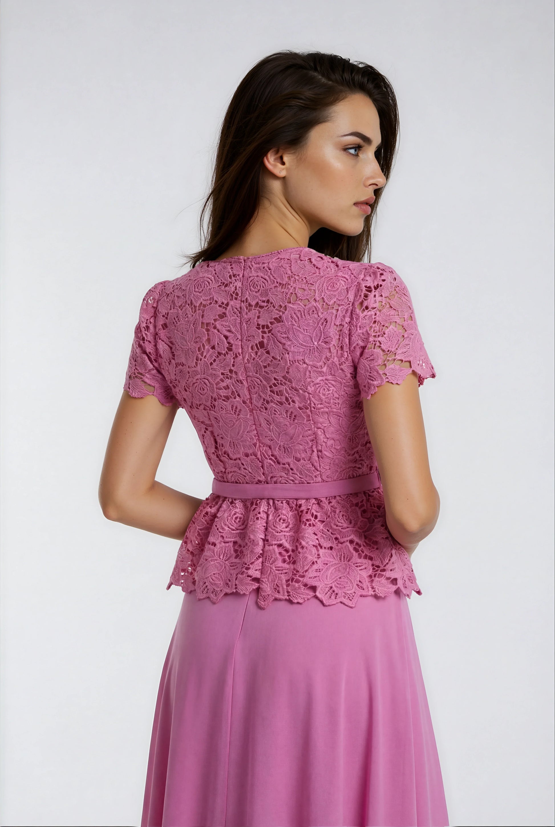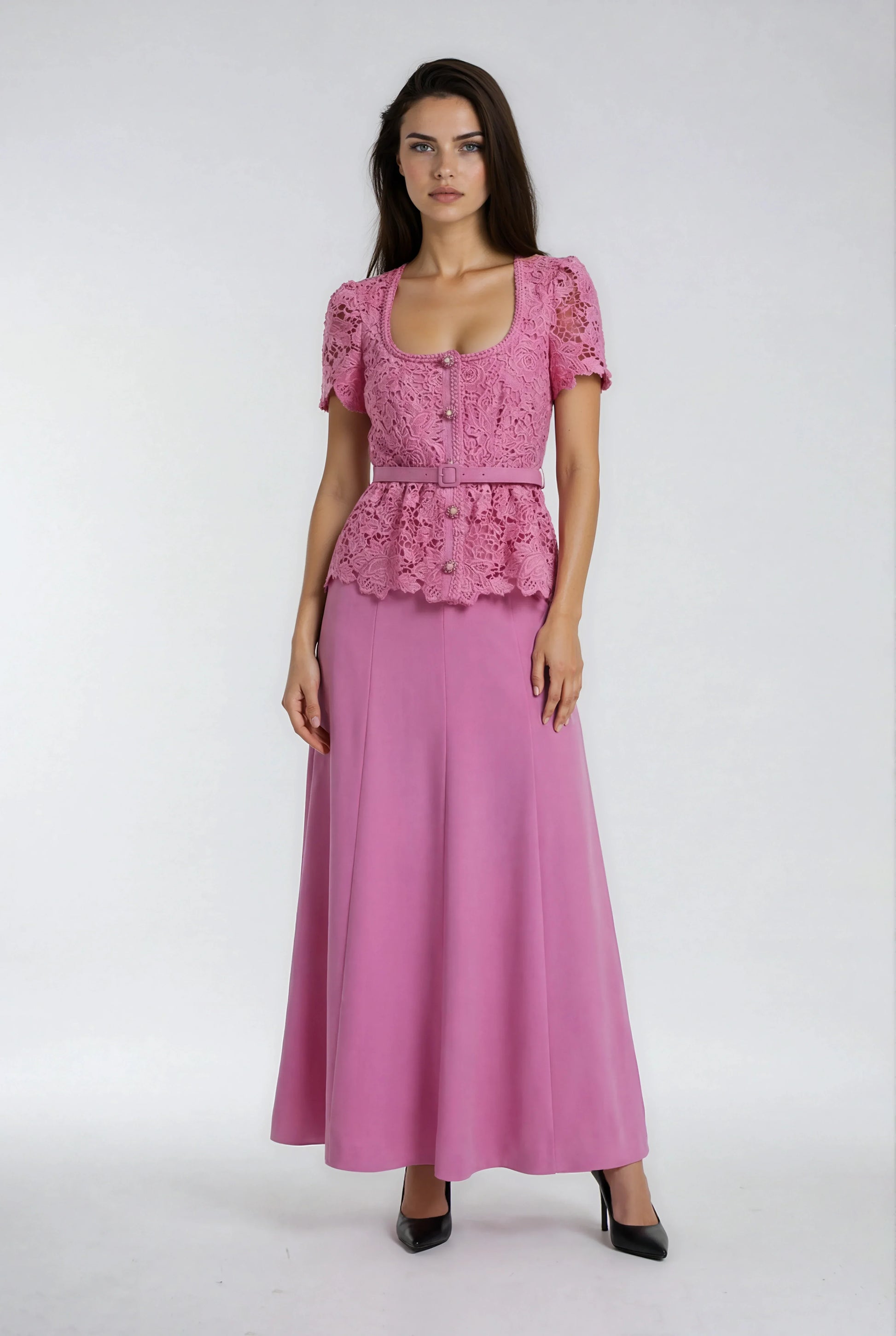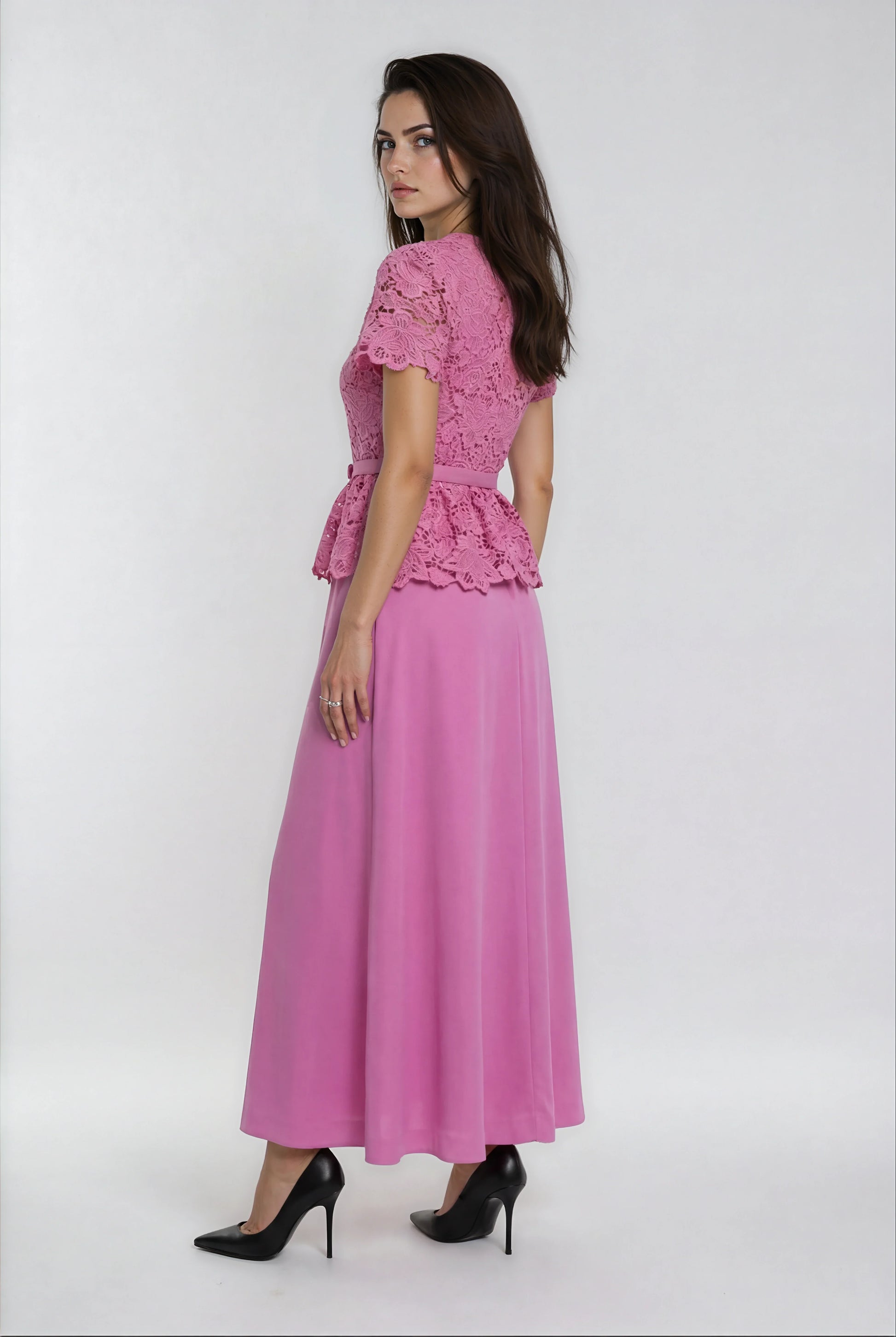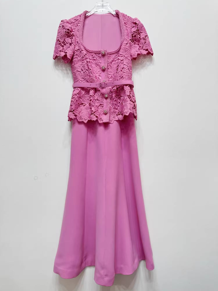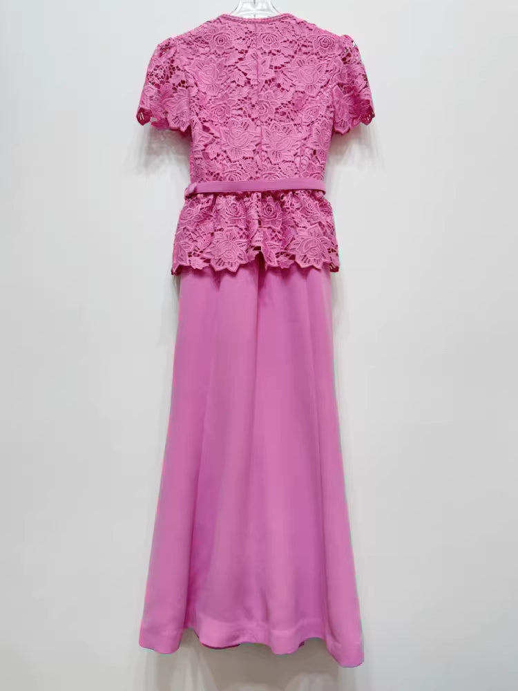 Bu uzun elbise, özel dantel süslemeleri romantik pembe rengiyle birleştiriyor. Yüksek bel tasarımı ve vücudu saran kesimiyle zarif ve uzun bir görünüm sunar. Öndeki gizli düğmeler ve etek ucundaki yan fermuar şık bir detay oluştururken, yanında verilen kemerle belinizi vurgulayabilirsiniz. Astarlı iç yapısı konforu artırır. Özel dantel işçiliği nedeniyle her elbise hafif farklılıklar gösterebilir.