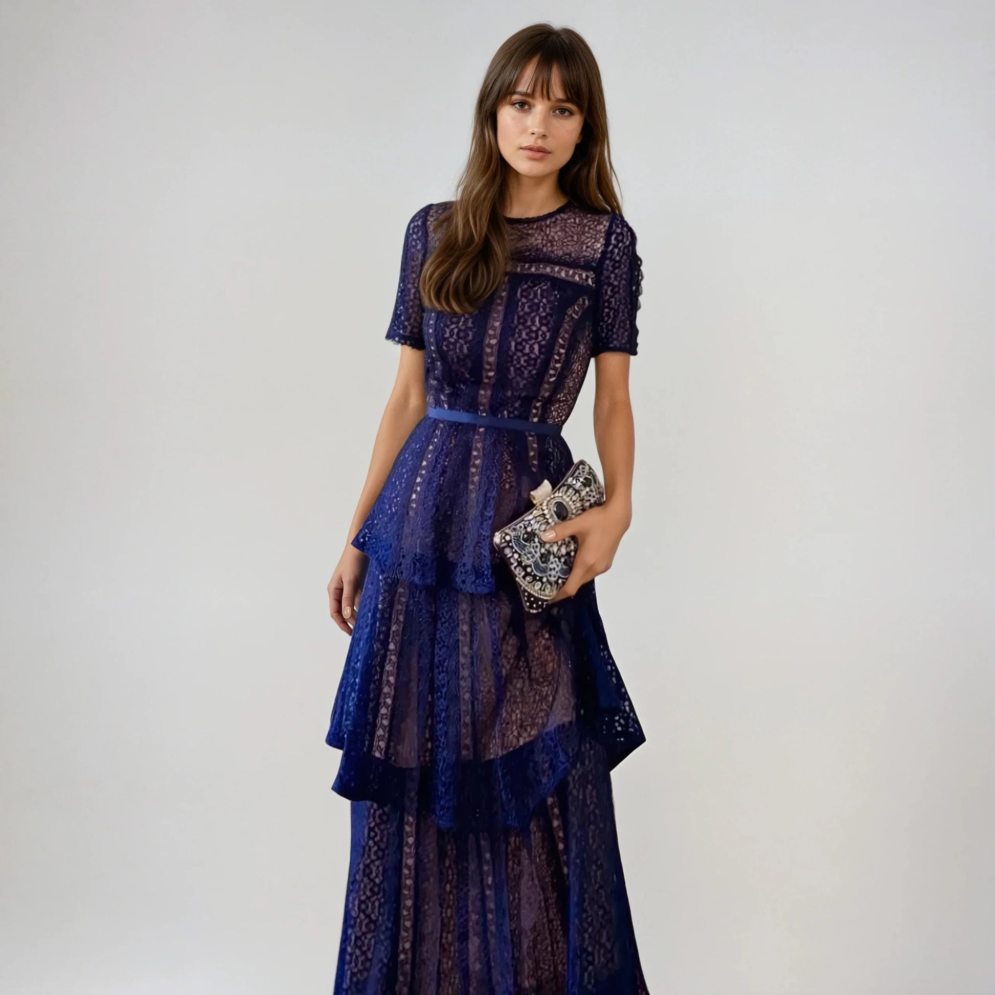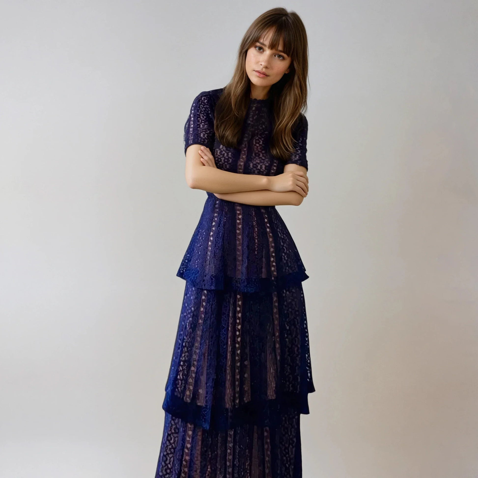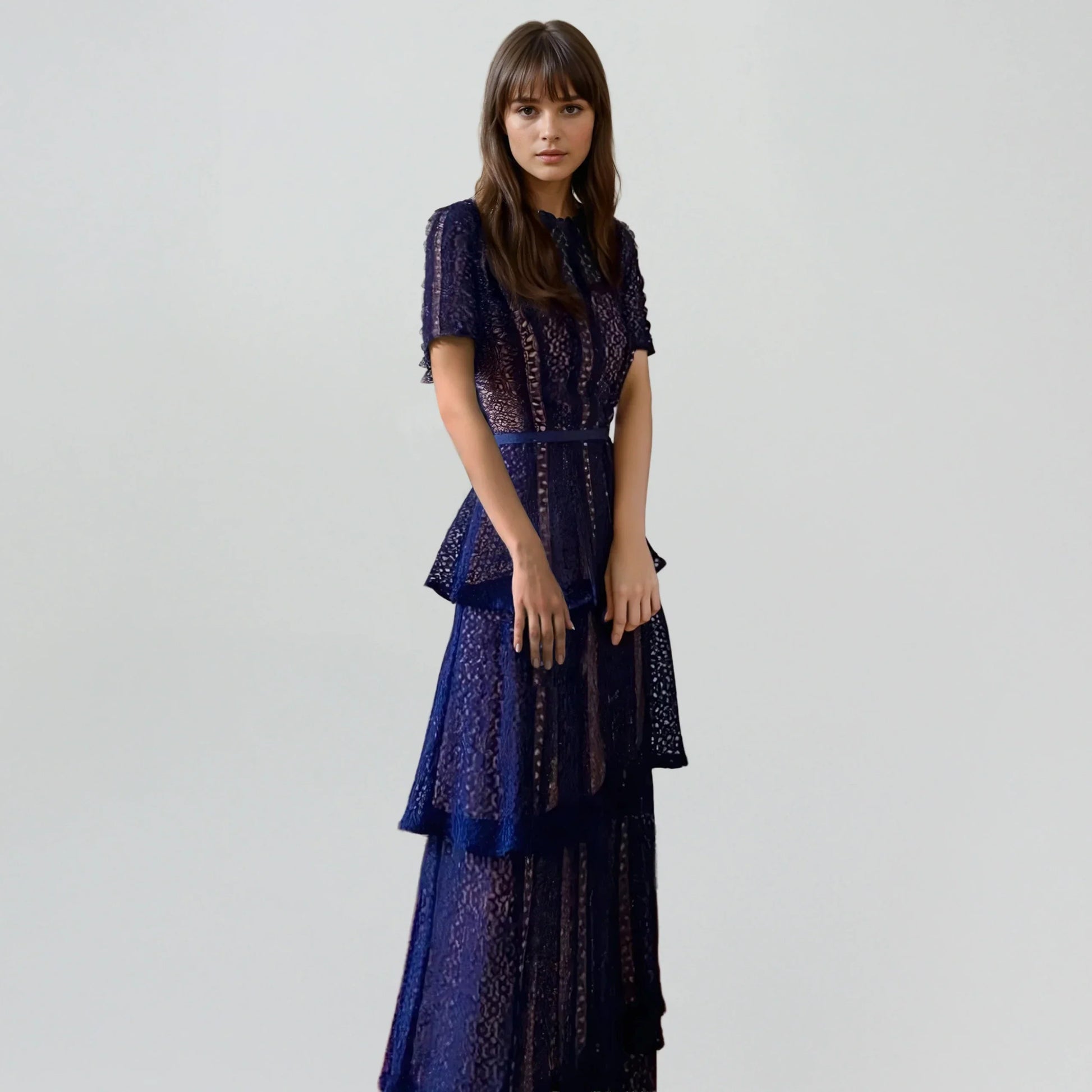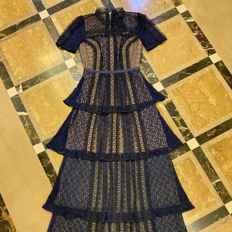 Lacivert Dantel Uzun Elbise