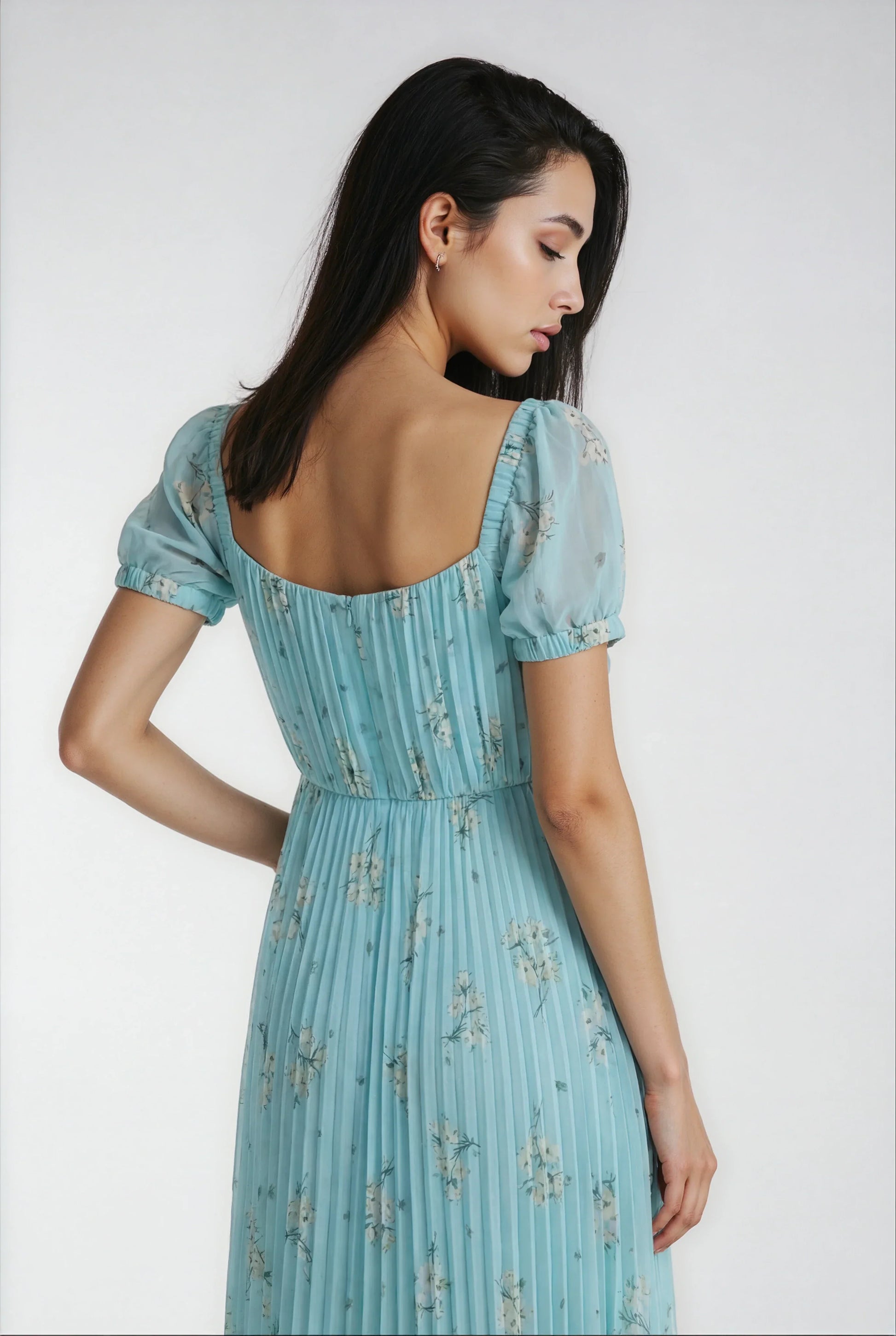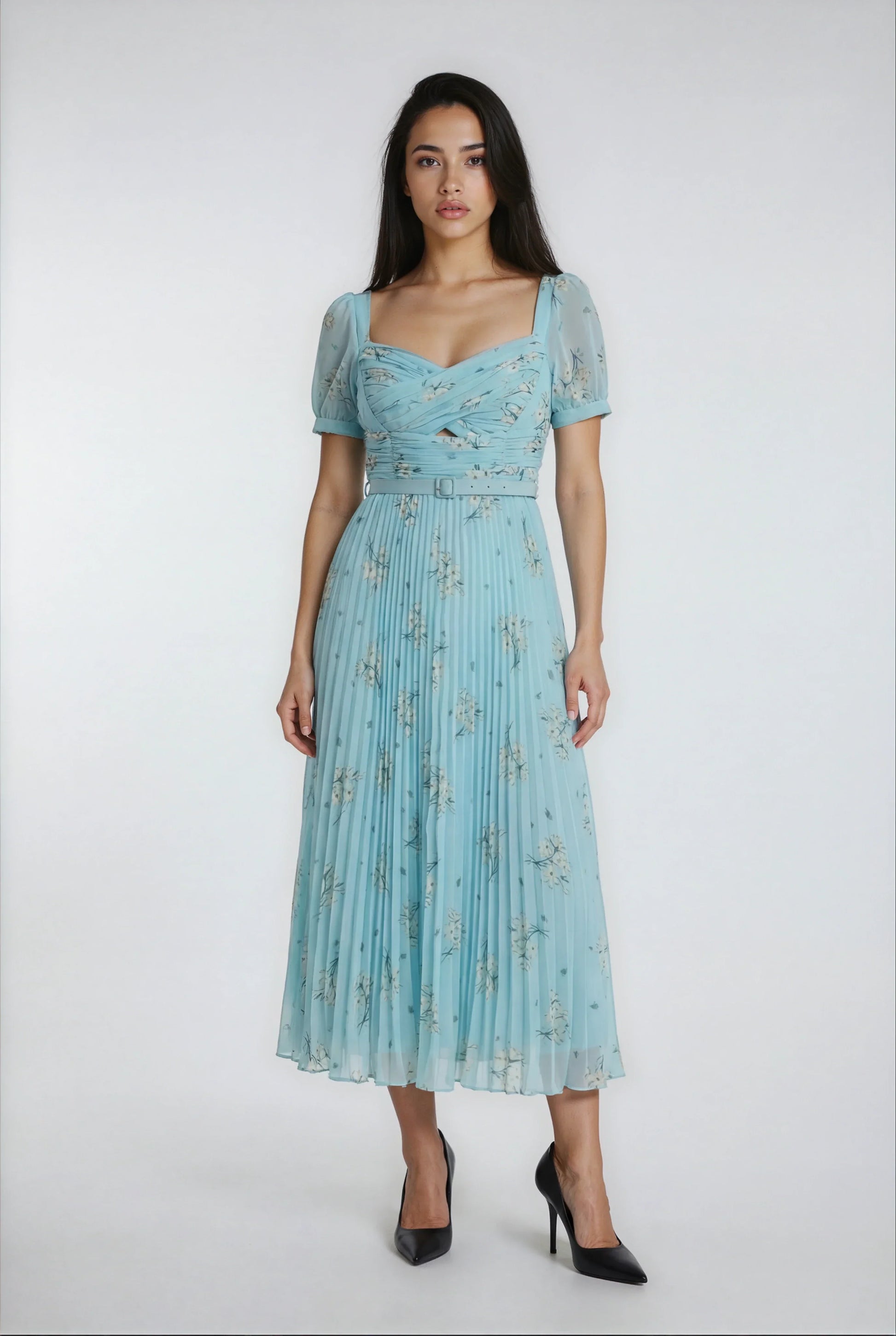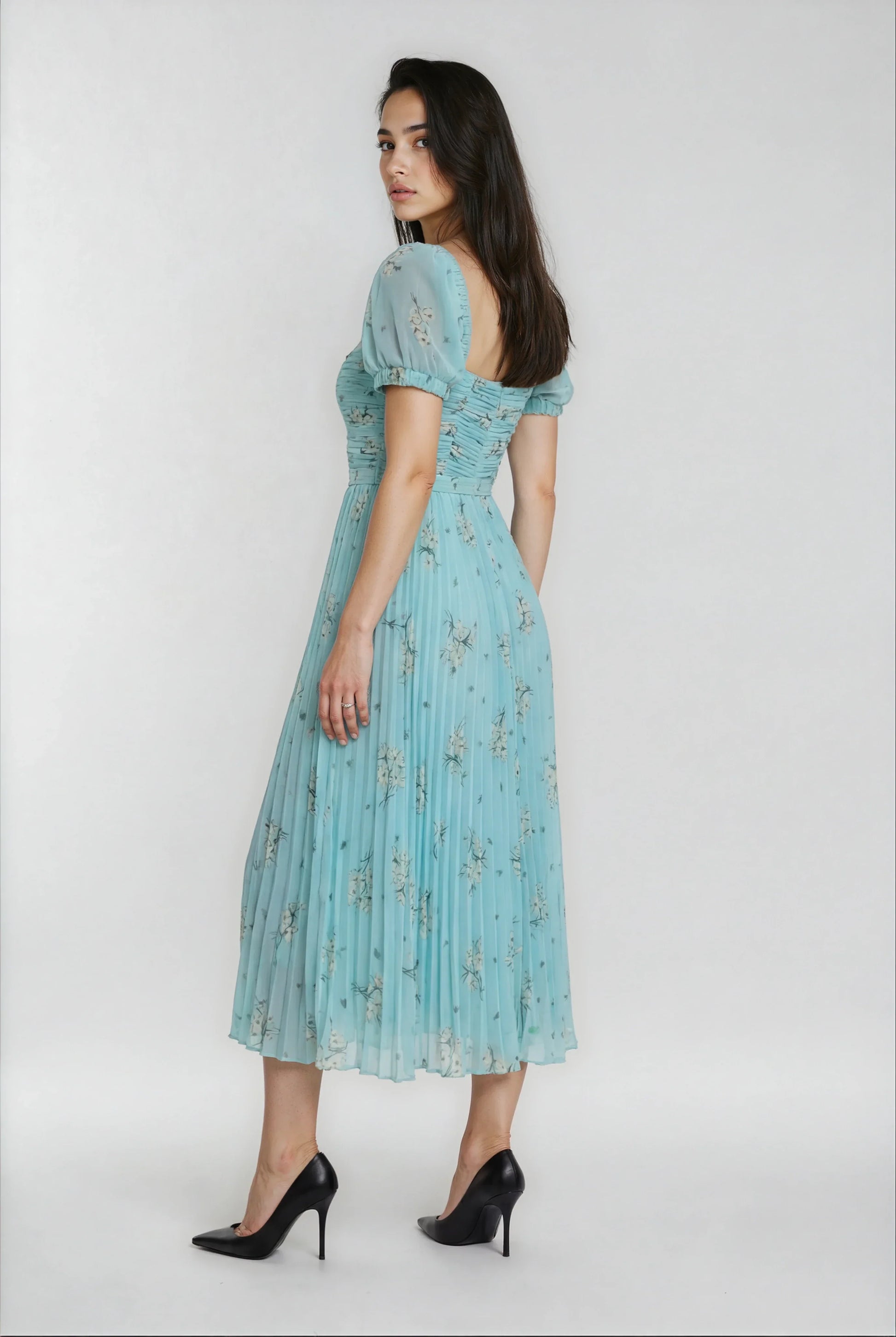 Bu elbise, zarif baskılı şifon kumaşı ve canlı yeşil rengiyle doğal bir şıklık sunuyor. Vücudu saran kesimi ve yüksek bel tasarımıyla şık ve dengeli bir görünüm sağlar. Arkadaki fermuar ile kolay giyilirken, yanında verilen kemerle belinizi vurgulayabilirsiniz. İç astarı konforu artırarak gün boyu rahatlık sağlar.